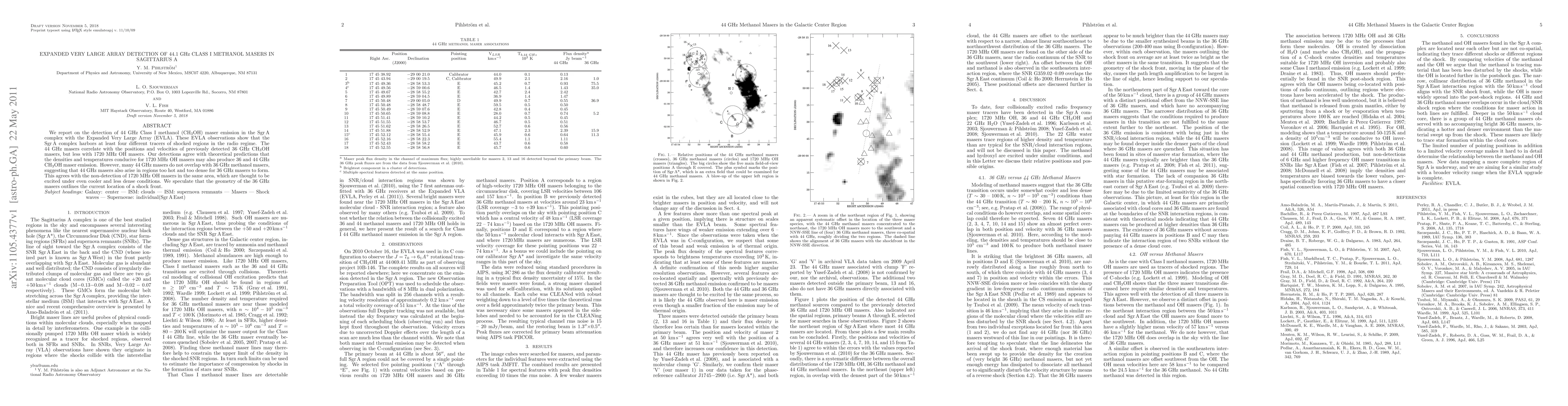 The Expanded Very Large Array (EVLA) detected 44 GHz Class I methanol masers in the Sagittarius A complex, indicating at least four different tracers of shocked regions in the radio regime. The findings suggest that while 44 GHz masers correlate with 36 GHz masers, they also arise in regions too hot and dense for 36 GHz masers to form, aligning with the non-detection of 1720 MHz OH masers in the same area.