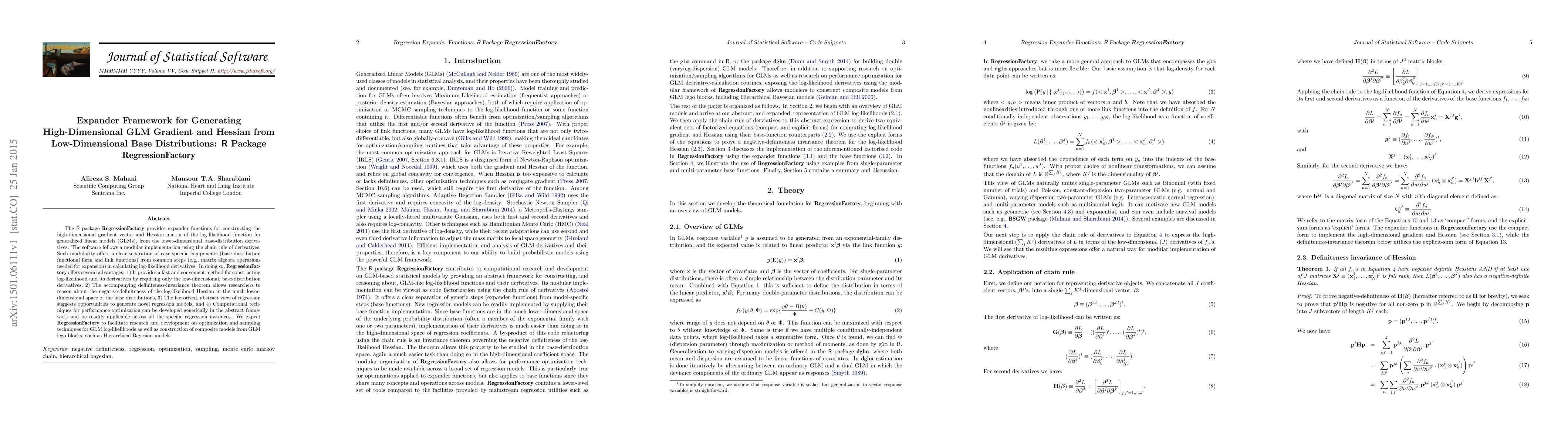 The R package RegressionFactory provides expander functions for constructing the high-dimensional gradient vector and Hessian matrix of the log-likelihood function for generalized linear models (GLMs), from the lower-dimensional base-distribution derivatives. The software follows a modular implementation using the chain rule of derivatives. Such modularity offers a clear separation of case-specific components (base distribution functional form and link functions) from common steps (e.g., matrix algebra operations needed for expansion) in calculating log-likelihood derivatives. In doing so, RegressionFactory offers several advantages: 1) It provides a fast and convenient method for constructing log-likelihood and its derivatives by requiring only the low-dimensional, base-distribution derivatives, 2) The accompanying definiteness-invariance theorem allows researchers to reason about the negative-definiteness of the log-likelihood Hessian in the much lower-dimensional space of the base distributions, 3) The factorized, abstract view of regression suggests opportunities to generate novel regression models, and 4) Computational techniques for performance optimization can be developed generically in the abstract framework and be readily applicable across all the specific regression instances. We expect RegressionFactory to facilitate research and development on optimization and sampling techniques for GLM log-likelihoods as well as construction of composite models from GLM lego blocks, such as Hierarchical Bayesian models.