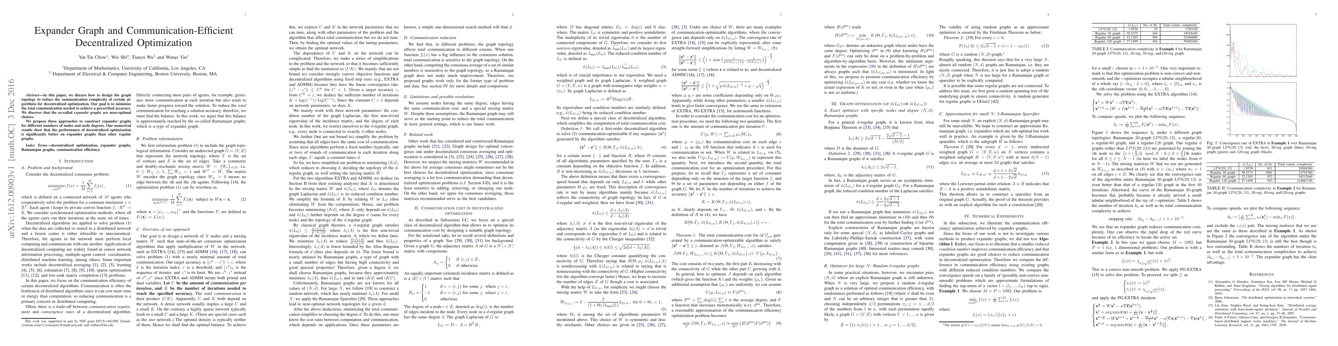 This paper explores the use of expander graphs to minimize communication complexity in decentralized optimization algorithms. It proposes three methods to construct expander graphs and demonstrates that they significantly outperform regular graphs in terms of optimization performance.