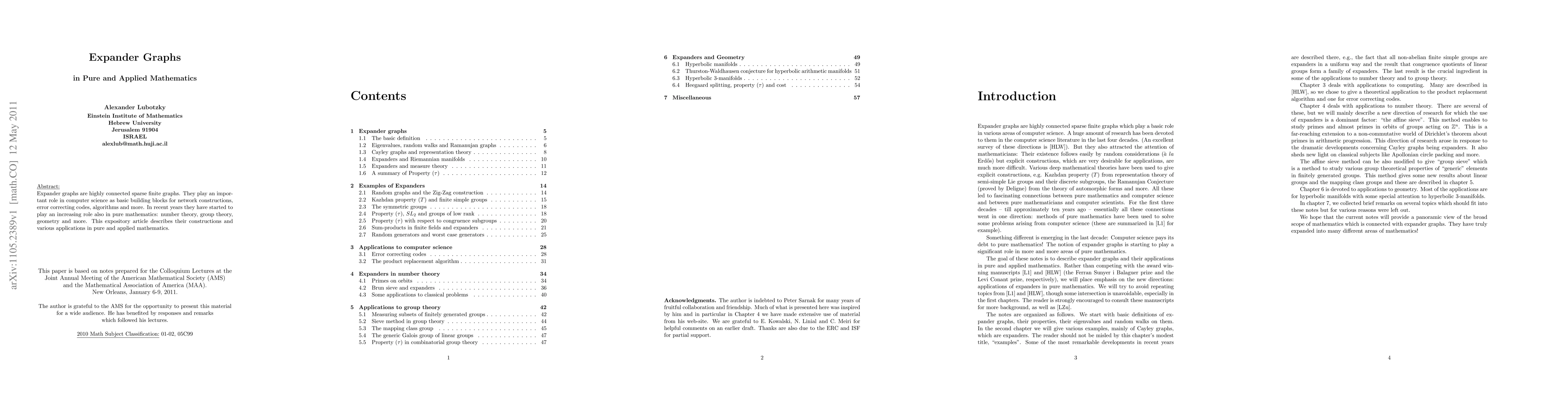 Expander graphs are crucial in computer science for network constructions, error-correcting codes, and randomization of probabilistic algorithms. Their applications in pure mathematics, including number theory, group theory, and geometry, are increasingly significant, offering new insights and solutions to longstanding problems.