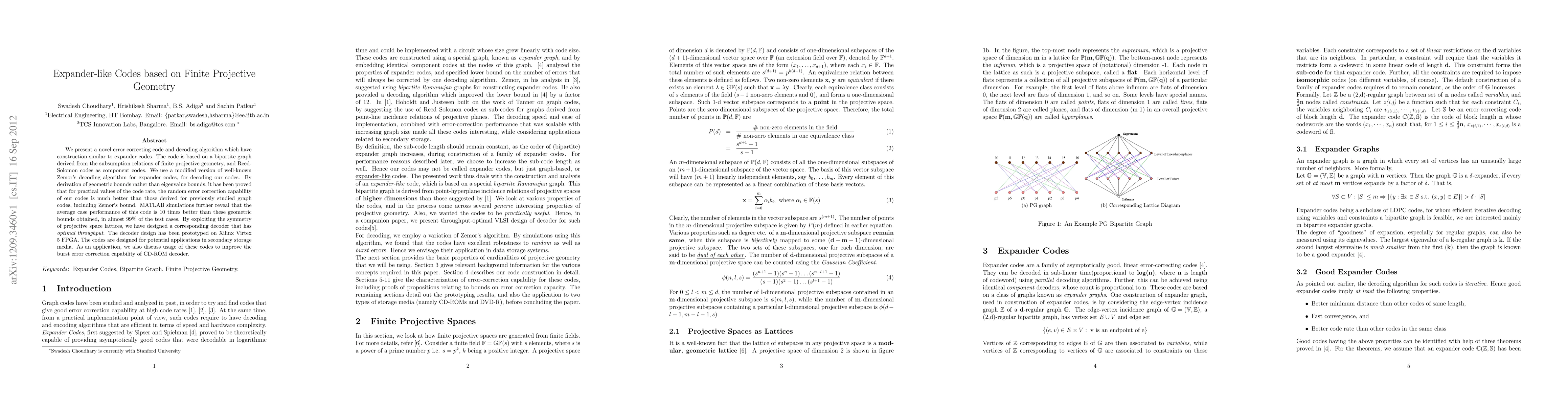 We present a novel error correcting code and decoding algorithm which have construction similar to expander codes. The code is based on a bipartite graph derived from the subsumption relations of finite projective geometry, and Reed-Solomon codes as component codes. We use a modified version of well-known Zemor's decoding algorithm for expander codes, for decoding our codes. By derivation of geometric bounds rather than eigenvalue bounds, it has been proved that for practical values of the code rate, the random error correction capability of our codes is much better than those derived for previously studied graph codes, including Zemor's bound. MATLAB simulations further reveal that the average case performance of this code is 10 times better than these geometric bounds obtained, in almost 99% of the test cases. By exploiting the symmetry of projective space lattices, we have designed a corresponding decoder that has optimal throughput. The decoder design has been prototyped on Xilinx Virtex 5 FPGA. The codes are designed for potential applications in secondary storage media. As an application, we also discuss usage of these codes to improve the burst error correction capability of CD-ROM decoder.