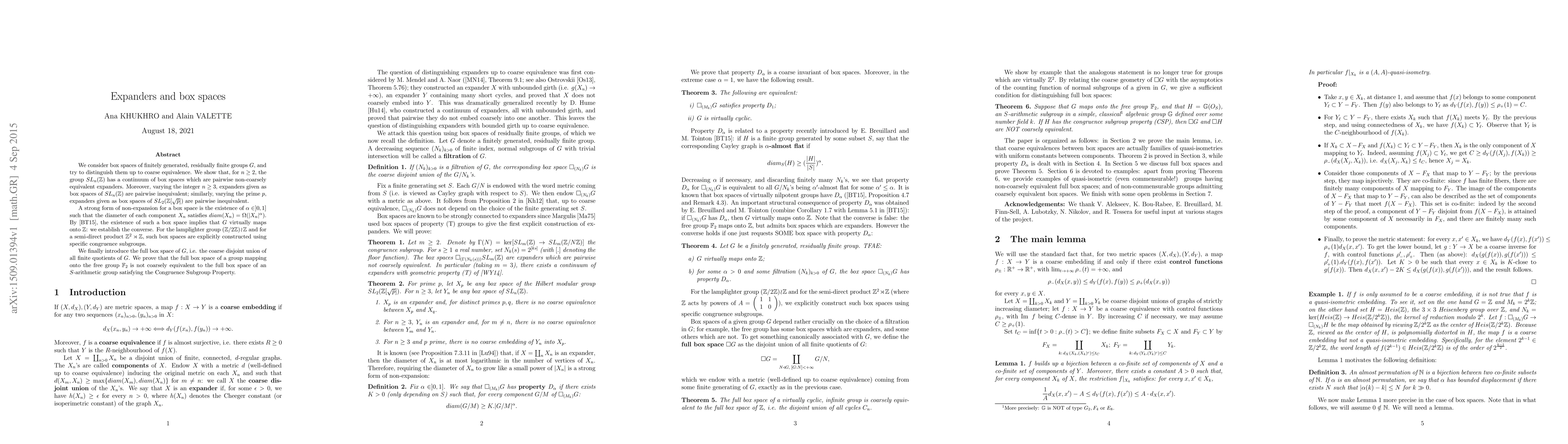 We consider box spaces of finitely generated, residually finite groups $G$, and try to distinguish them up to coarse equivalence. We show that, for $n\geq 2$, the group $SL_n(\mathbb{Z})$ has a continuum of box spaces which are pairwise non-coarsely equivalent expanders. Moreover, varying the integer $n\geq 3$, expanders given as box spaces of $SL_n(\mathbb{Z})$ are pairwise inequivalent; similarly, varying the prime $p$, expanders given as box spaces of $SL_2(\mathbb{Z}[\sqrt{p}])$ are pairwise inequivalent. A strong form of non-expansion for a box space is the existence of $\alpha\in]0,1]$ such that the diameter of each component $X_n$ satisfies $diam(X_n)=\Omega(|X_n|^\alpha)$. By a result of Breuillard and Tointon, the existence of such a box space implies that $G$ virtually maps onto $\mathbb{Z}$: we establish the converse. For the lamplighter group $(\mathbb{Z}/2\mathbb{Z})\wr\mathbb{Z}$ and for a semi-direct product $\mathbb{Z}^2\rtimes\mathbb{Z}$, such box spaces are explicitly constructed using specific congruence subgroups. We finally introduce the full box space of $G$, i.e. the coarse disjoint union of all finite quotients of $G$. We prove that the full box space of a group mapping onto the free group $\mathbb{F}_2$ is not coarsely equivalent to the full box space of an $S$-arithmetic group satisfying the Congruence Subgroup Property.