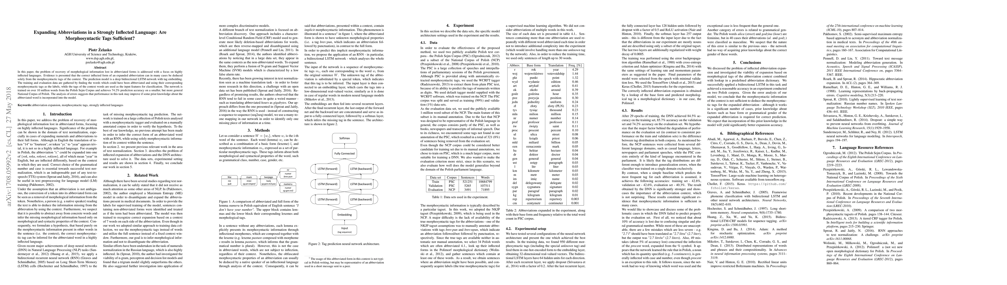 In this paper, the problem of recovery of morphological information lost in abbreviated forms is addressed with a focus on highly inflected languages. Evidence is presented that the correct inflected form of an expanded abbreviation can in many cases be deduced solely from the morphosyntactic tags of the context. The prediction model is a deep bidirectional LSTM network with tag embedding. The training and evaluation data are gathered by finding the words which could have been abbreviated and using their corresponding morphosyntactic tags as the labels, while the tags of the context words are used as the input features for classification. The network is trained on over 10 million words from the Polish Sejm Corpus and achieves 74.2% prediction accuracy on a smaller, but more general National Corpus of Polish. The analysis of errors suggests that performance in this task may improve if some prior knowledge about the abbreviated word is incorporated into the model.