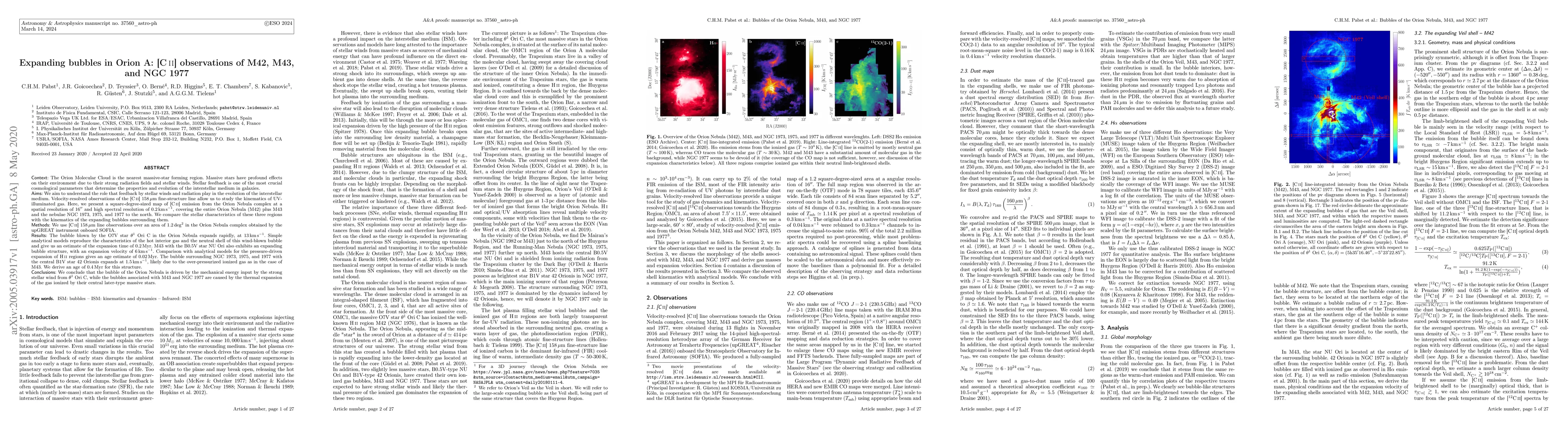 This study uses [CII] $158\,\mu\mathrm{m}$ line observations to analyze the kinematics of UV-illuminated gas in expanding bubbles around the Orion Nebula, M43, and NGC 1977. The findings suggest that the Orion Nebula's bubble is driven by the stellar wind from $\theta^1$ Ori C, while M43 and NGC 1977's bubbles are due to thermal expansion from their central stars.