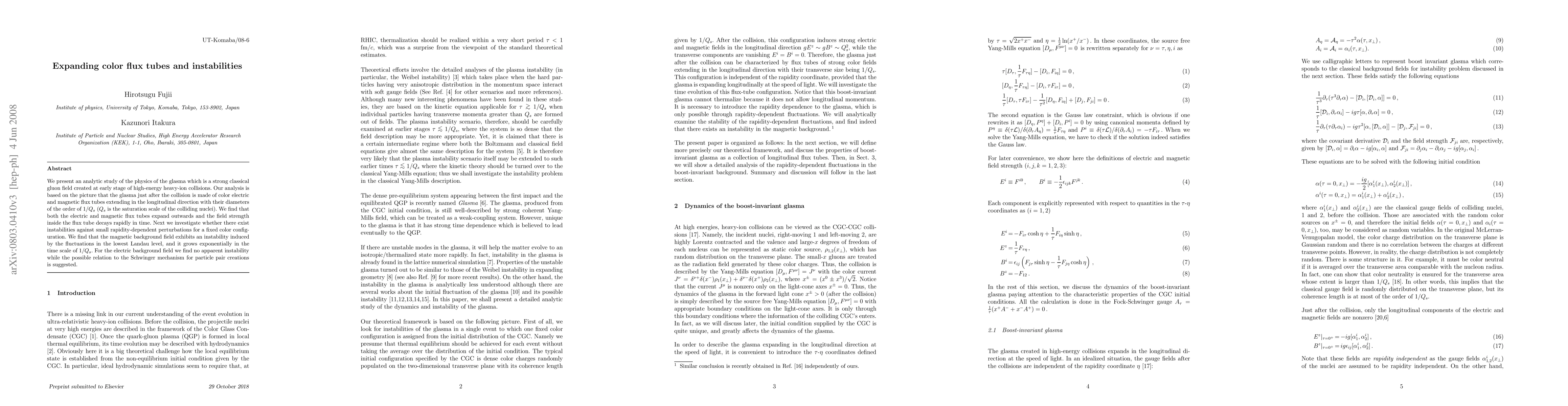 This paper analytically explores the dynamics of the glasma, a strong gluon field formed post high-energy heavy-ion collisions, focusing on expanding color flux tubes. It identifies instabilities in the magnetic field due to fluctuations in the lowest Landau level, while no such instability is found in the electric field, hinting at potential particle pair creation via the Schwinger mechanism.