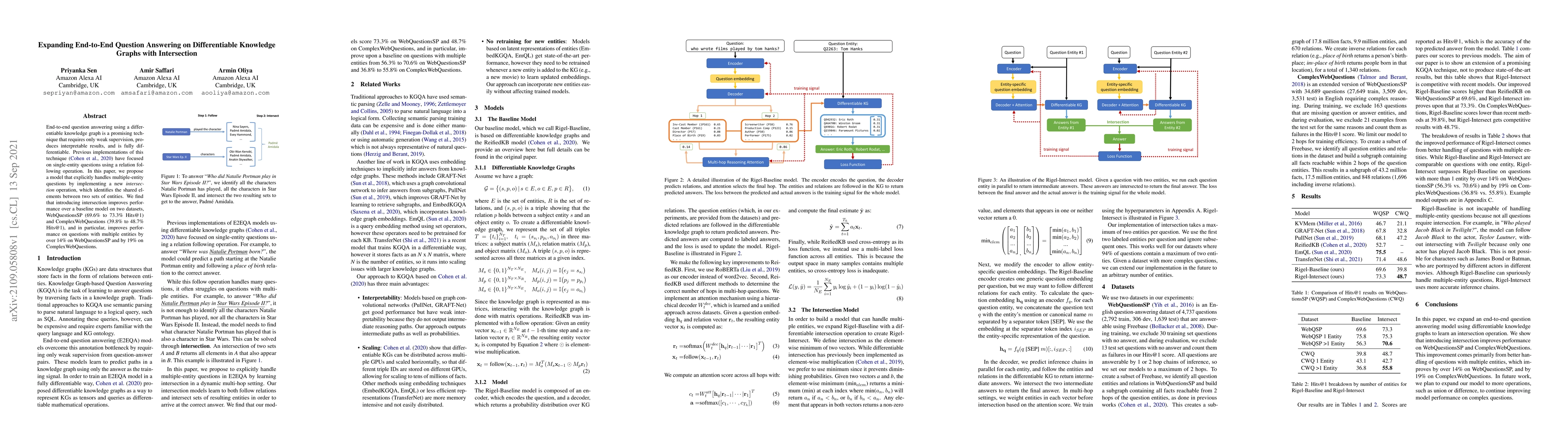 This paper proposes a model for end-to-end question answering using differentiable knowledge graphs that incorporates an intersection operation to handle multiple-entity questions. The new approach improves performance on datasets WebQuestionsSP and ComplexWebQuestions, especially for questions involving multiple entities.