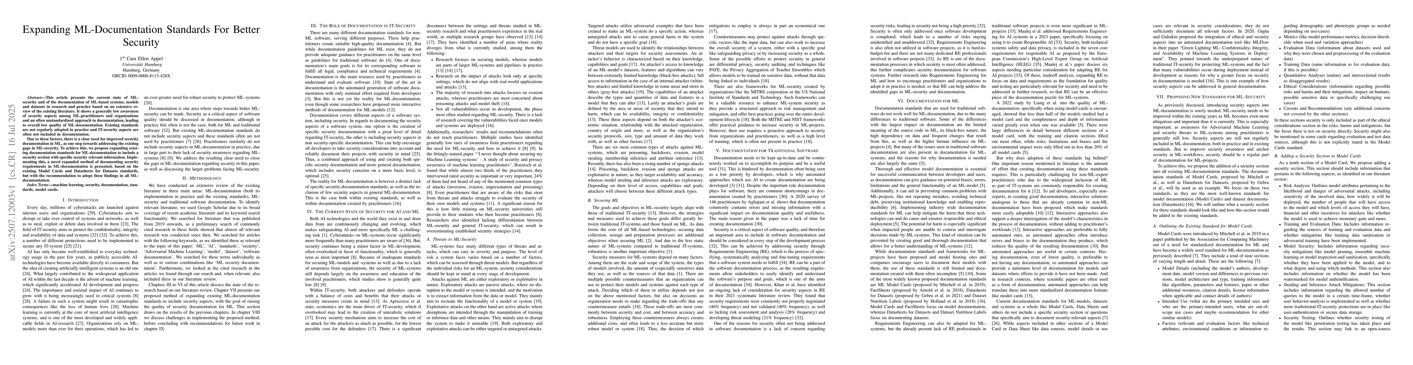 This article presents the current state of ML-security and of the documentation of ML-based systems, models and datasets in research and practice based on an extensive review of the existing literature. It shows a generally low awareness of security aspects among ML-practitioners and organizations and an often unstandardized approach to documentation, leading to overall low quality of ML-documentation. Existing standards are not regularly adopted in practice and IT-security aspects are often not included in documentation. Due to these factors, there is a clear need for improved security documentation in ML, as one step towards addressing the existing gaps in ML-security. To achieve this, we propose expanding existing documentation standards for ML-documentation to include a security section with specific security relevant information. Implementing this, a novel expanded method of documenting security requirements in ML-documentation is presented, based on the existing Model Cards and Datasheets for Datasets standards, but with the recommendation to adopt these findings in all ML-documentation.