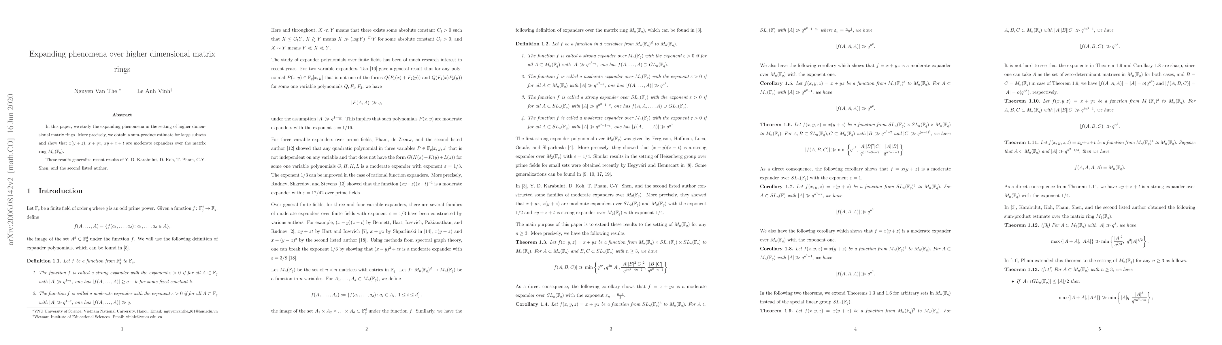 This paper investigates expanding phenomena in higher dimensional matrix rings, obtaining sum-product estimates for large subsets. It demonstrates that expressions like x+yz and x(y+z) behave as moderate expanders, while xy + z + t functions as a strong expander, generalizing previous research in the field.