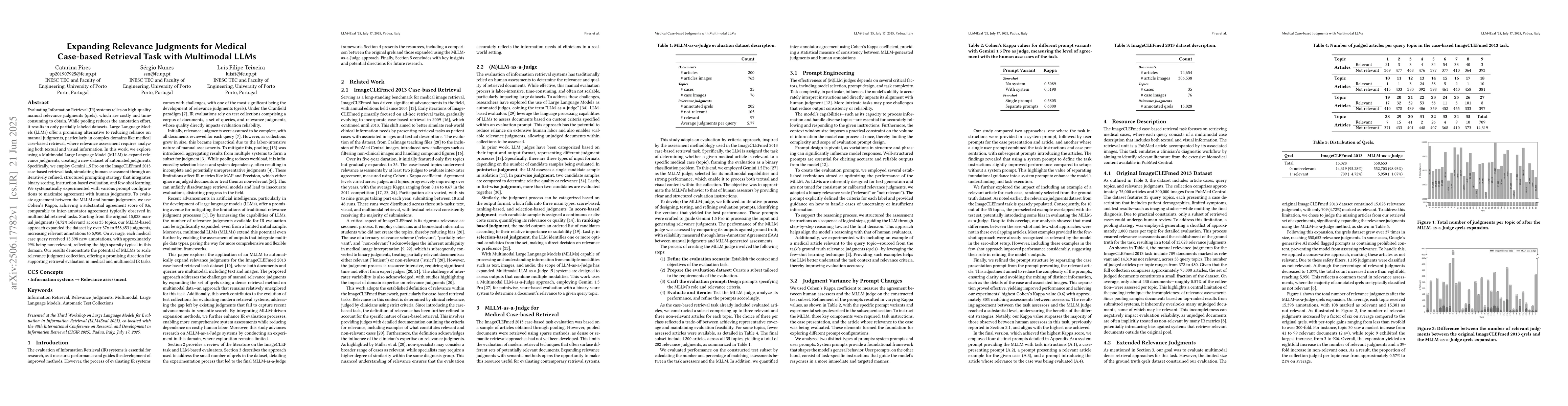 Evaluating Information Retrieval (IR) systems relies on high-quality manual relevance judgments (qrels), which are costly and time-consuming to obtain. While pooling reduces the annotation effort, it results in only partially labeled datasets. Large Language Models (LLMs) offer a promising alternative to reducing reliance on manual judgments, particularly in complex domains like medical case-based retrieval, where relevance assessment requires analyzing both textual and visual information. In this work, we explore using a Multimodal Large Language Model (MLLM) to expand relevance judgments, creating a new dataset of automated judgments. Specifically, we employ Gemini 1.5 Pro on the ImageCLEFmed 2013 case-based retrieval task, simulating human assessment through an iteratively refined, structured prompting strategy that integrates binary scoring, instruction-based evaluation, and few-shot learning. We systematically experimented with various prompt configurations to maximize agreement with human judgments. To evaluate agreement between the MLLM and human judgments, we use Cohen's Kappa, achieving a substantial agreement score of 0.6, comparable to inter-annotator agreement typically observed in multimodal retrieval tasks. Starting from the original 15,028 manual judgments (4.72% relevant) across 35 topics, our MLLM-based approach expanded the dataset by over 37x to 558,653 judgments, increasing relevant annotations to 5,950. On average, each medical case query received 15,398 new annotations, with approximately 99% being non-relevant, reflecting the high sparsity typical in this domain. Our results demonstrate the potential of MLLMs to scale relevance judgment collection, offering a promising direction for supporting retrieval evaluation in medical and multimodal IR tasks.