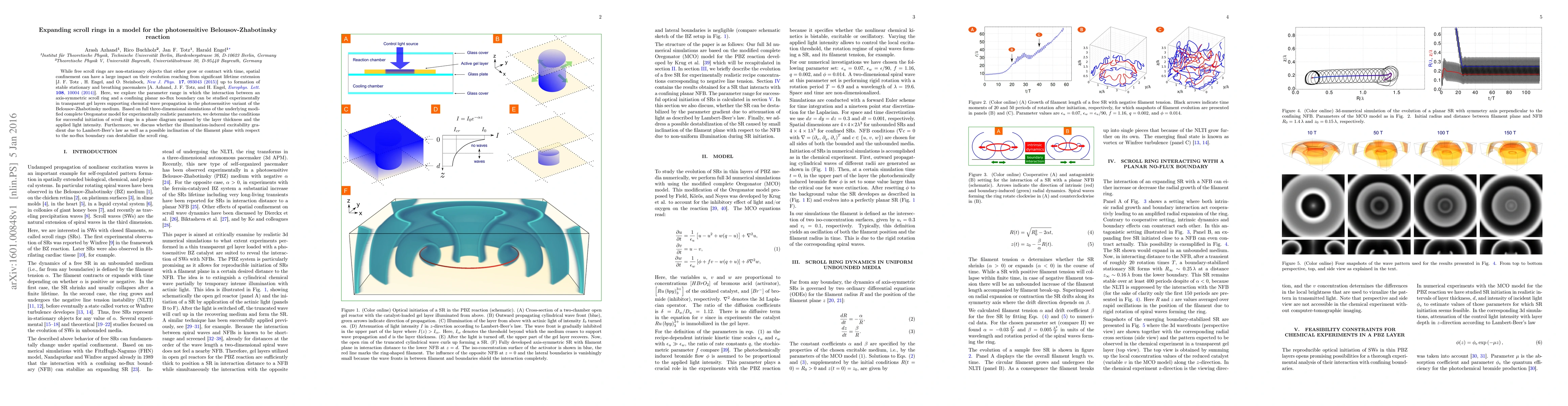 While free scroll rings are non-stationary objects that either grow or contract with time, spatial confinement can have a large impact on their evolution reaching from significant lifetime extension [J. F. Totz , H. Engel, and O. Steinbock, New J. Phys. 17, 093043 (2015)] up to formation of stable stationary and breathing pacemakers [A. Azhand, J. F. Totz, and H. Engel, Europhys. Lett. 108, 10004 (2014)]. Here, we explore the parameter range in which the interaction between an axis-symmetric scroll ring and a confining planar no-flux boundary can be studied experimentally in transparent gel layers supporting chemical wave propagation in the photosensitive variant of the Belousov-Zhabotinsky medium. Based on full three-dimensional simulations of the underlying modified complete Oregonator model for experimentally realistic parameters, we determine the conditions for successful initiation of scroll rings in a phase diagram spanned by the layer thickness and the applied light intensity. Furthermore, we discuss whether the illumination-induced excitability gradient due to Lambert-Beer's law as well as a possible inclination of the filament plane with respect to the no-flux boundary can destabilize the scroll ring.
