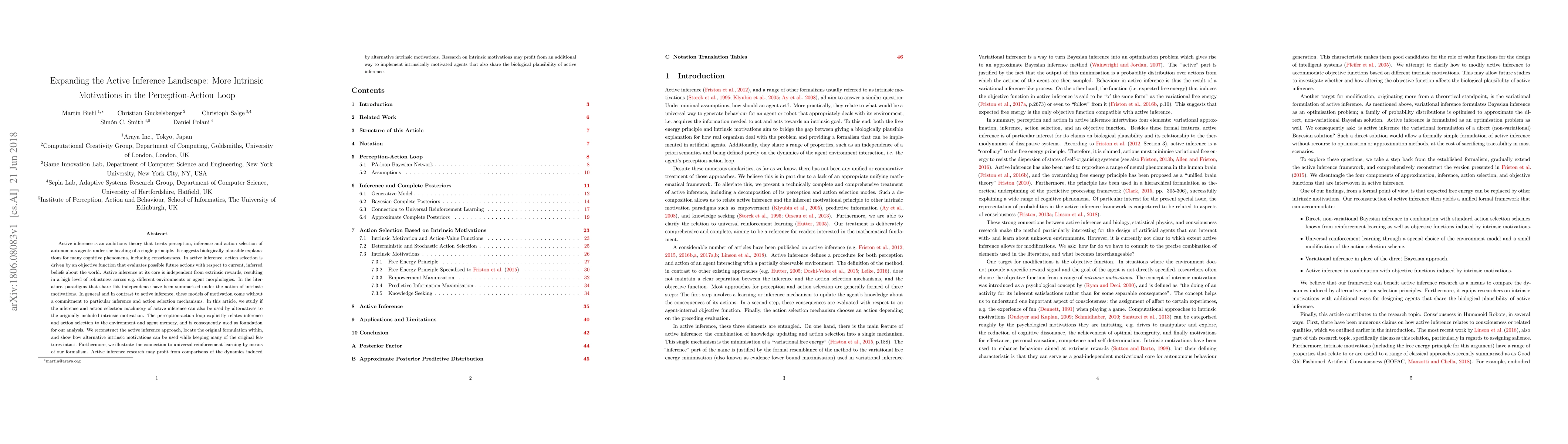 Active inference is an ambitious theory that treats perception, inference and action selection of autonomous agents under the heading of a single principle. It suggests biologically plausible explanations for many cognitive phenomena, including consciousness. In active inference, action selection is driven by an objective function that evaluates possible future actions with respect to current, inferred beliefs about the world. Active inference at its core is independent from extrinsic rewards, resulting in a high level of robustness across e.g.\ different environments or agent morphologies. In the literature, paradigms that share this independence have been summarised under the notion of intrinsic motivations. In general and in contrast to active inference, these models of motivation come without a commitment to particular inference and action selection mechanisms. In this article, we study if the inference and action selection machinery of active inference can also be used by alternatives to the originally included intrinsic motivation. The perception-action loop explicitly relates inference and action selection to the environment and agent memory, and is consequently used as foundation for our analysis. We reconstruct the active inference approach, locate the original formulation within, and show how alternative intrinsic motivations can be used while keeping many of the original features intact. Furthermore, we illustrate the connection to universal reinforcement learning by means of our formalism. Active inference research may profit from comparisons of the dynamics induced by alternative intrinsic motivations. Research on intrinsic motivations may profit from an additional way to implement intrinsically motivated agents that also share the biological plausibility of active inference.
