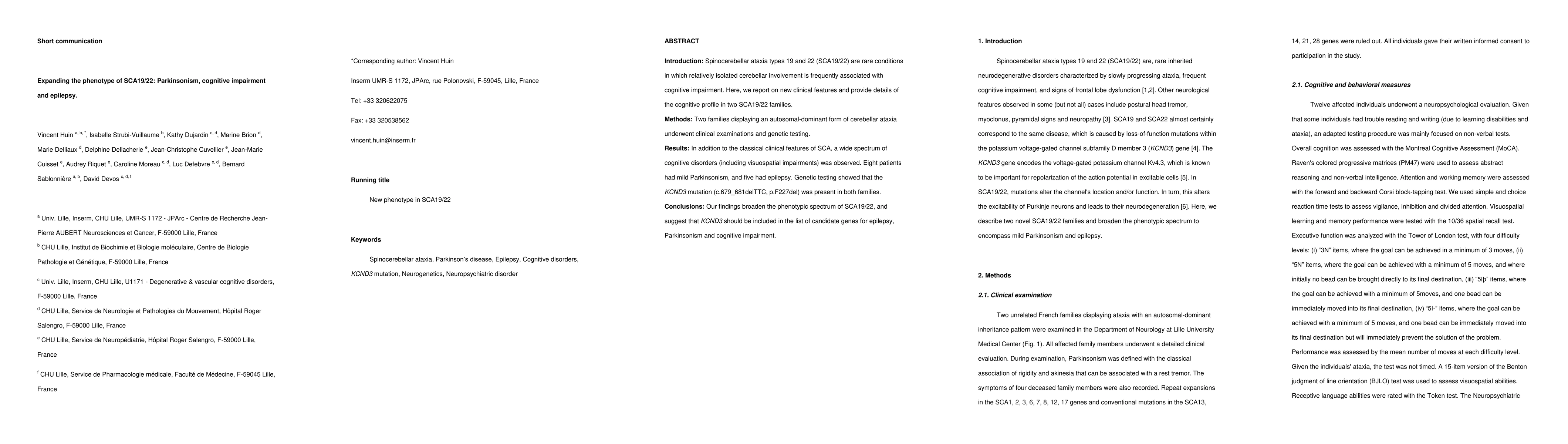 BACKGROUND: Spinocerebellar ataxia types 19 and 22 (SCA19/22) are rare conditions in which relatively isolated cerebellar involvement is frequently associated with cognitive impairment. Here, we report on new clinical features and provide details of the cognitive profile in two SCA19/22 families.METHODS: Two families displaying an autosomal-dominant form of cerebellar ataxia underwent clinical examinations and genetic testing.RESULTS: In addition to the classical clinical features of SCA, a wide spectrum of cognitive disorders (including visuospatial impairments) was observed. Eight patients had mild Parkinsonism, and five had epilepsy. Genetic testing showed that the KCND3 mutation (c.679_681delTTC, p.F227del) was present in both families.CONCLUSIONS: Our findings broaden the phenotypic spectrum of SCA19/22, and suggest that KCND3 should be included in the list of candidate genes for epilepsy, Parkinsonism and cognitive impairment.