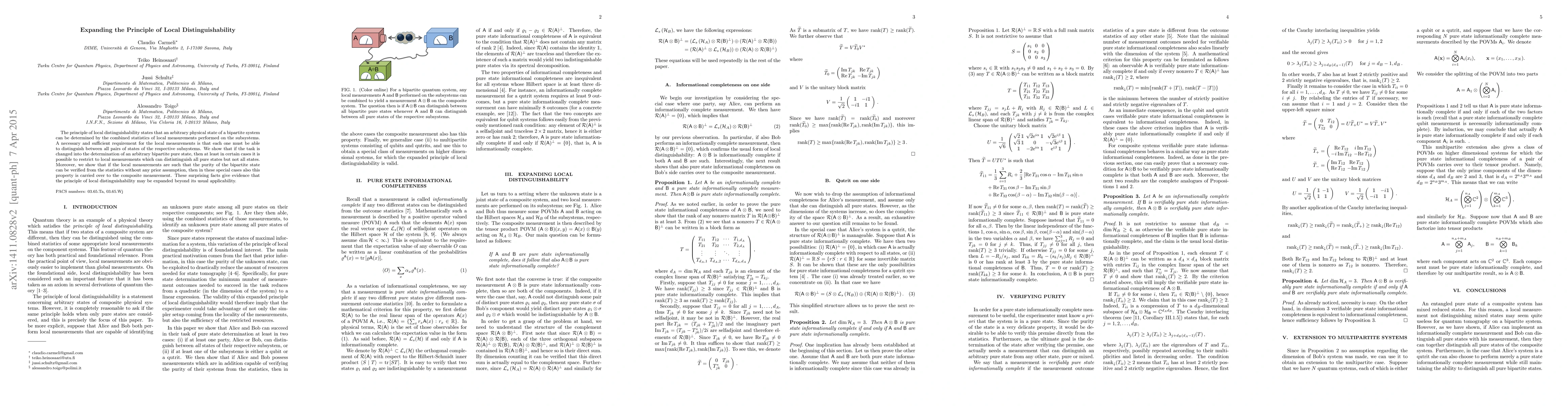 The principle of local distinguishability states that an arbitrary physical state of a bipartite system can be determined by the combined statistics of local measurements performed on the subsystems. A necessary and sufficient requirement for the local measurements is that each one must be able to distinguish between all pairs of states of the respective subsystems. We show that if the task is changed into the determination of an arbitrary bipartite pure state, then at least in certain cases it is possible to restrict to local measurements which can distintinguish all pure states but not all states. This surprising fact gives evidence that the principle of local distinguishability may be expanded beyond its usual applicability.