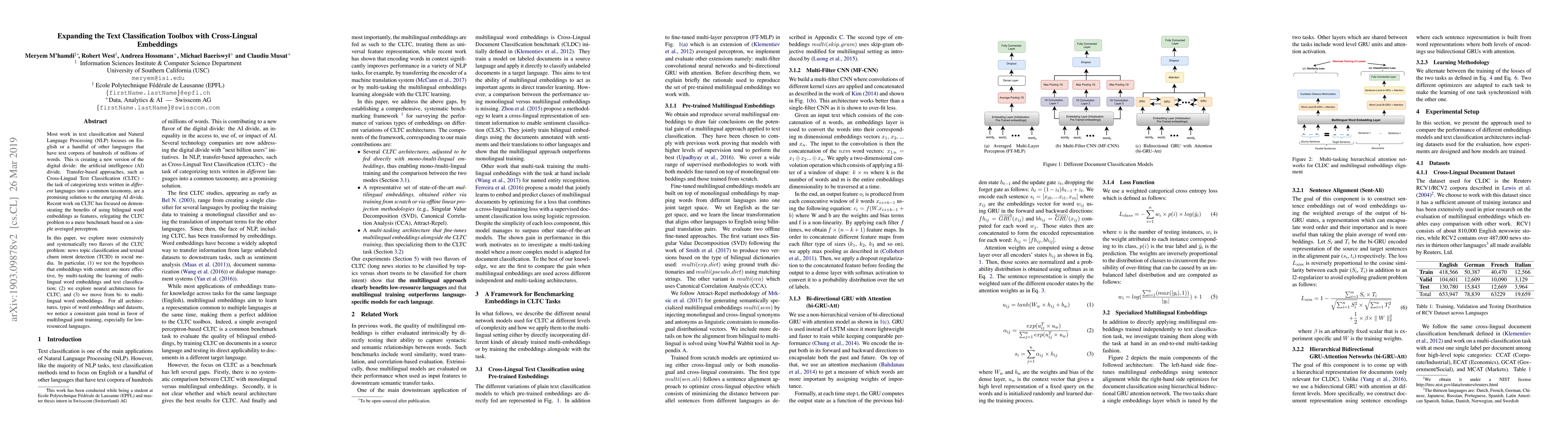 Most work in text classification and Natural Language Processing (NLP) focuses on English or a handful of other languages that have text corpora of hundreds of millions of words. This is creating a new version of the digital divide: the artificial intelligence (AI) divide. Transfer-based approaches, such as Cross-Lingual Text Classification (CLTC) - the task of categorizing texts written in different languages into a common taxonomy, are a promising solution to the emerging AI divide. Recent work on CLTC has focused on demonstrating the benefits of using bilingual word embeddings as features, relegating the CLTC problem to a mere benchmark based on a simple averaged perceptron. In this paper, we explore more extensively and systematically two flavors of the CLTC problem: news topic classification and textual churn intent detection (TCID) in social media. In particular, we test the hypothesis that embeddings with context are more effective, by multi-tasking the learning of multilingual word embeddings and text classification; we explore neural architectures for CLTC; and we move from bi- to multi-lingual word embeddings. For all architectures, types of word embeddings and datasets, we notice a consistent gain trend in favor of multilingual joint training, especially for low-resourced languages.