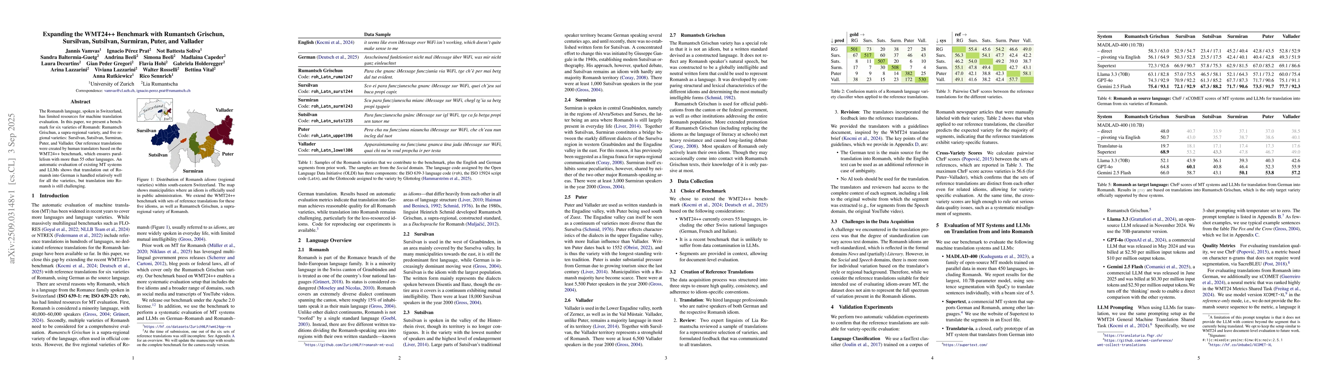 The Romansh language, spoken in Switzerland, has limited resources for machine translation evaluation. In this paper, we present a benchmark for six varieties of Romansh: Rumantsch Grischun, a supra-regional variety, and five regional varieties: Sursilvan, Sutsilvan, Surmiran, Puter, and Vallader. Our reference translations were created by human translators based on the WMT24++ benchmark, which ensures parallelism with more than 55 other languages. An automatic evaluation of existing MT systems and LLMs shows that translation out of Romansh into German is handled relatively well for all the varieties, but translation into Romansh is still challenging.