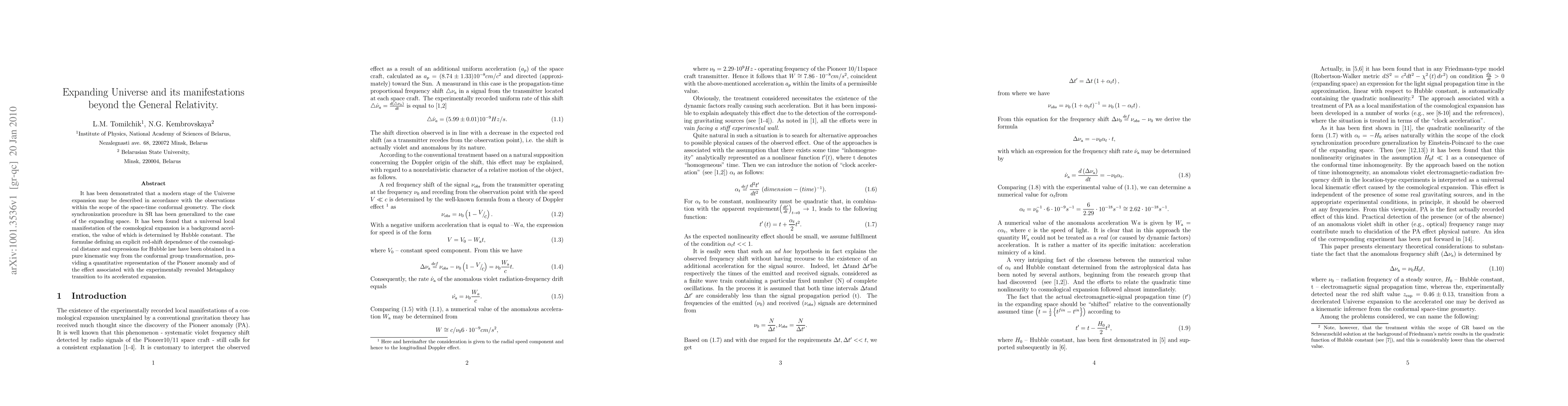 It has been demonstrated that a modern stage of the Universe expansion may be described in accordance with the observations within the scope of the space-time conformal geometry. The clock synchronization procedure in SR has been generalized to the case of the expanding space. It has been found that a universal local manifestation of the cosmological expansion is a background acceleration, the value of which is determined by Hubble constant. The formulae defining an explicit red-shift dependence of the cosmological distance and expressions for Hubble law have been obtained in a pure kinematic way from the conformal group transformation, providing a quantitative representation of the Pioneer anomaly and of the effect associated with the experimentally revealed Metagalaxy transition to its accelerated expansion