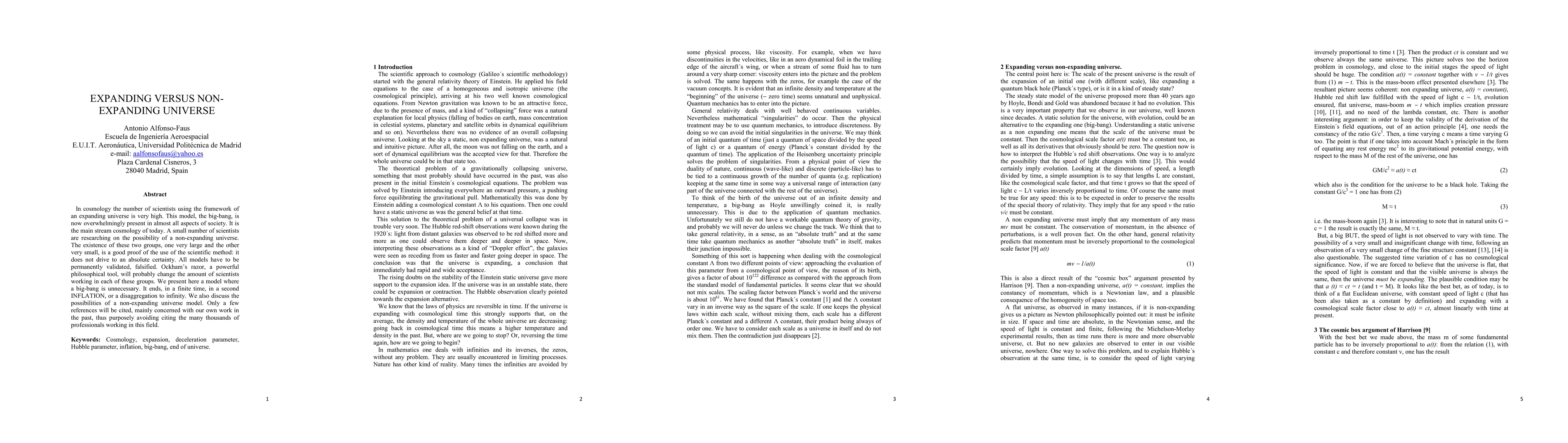 In cosmology the number of scientists using the framework of an expanding universe is very high. This model, the big-bang, is now overwhelmingly present in almost all aspects of society. It is the main stream cosmology of today. A small number of scientists are researching on the possibility of a non-expanding universe. The existence of these two groups, one very large and the other very small, is a good proof of the use of the scientific method: it does not drive to an absolute certainty. All models have to be permanently validated, falsified. Ockham's razor, a powerful philosophical tool, will probably change the amount of scientists working in each of these groups. We present here a model where a big-bang is unnecessary. It ends, in a finite time, in a second INFLATION, or a disaggregation to infinity. We also discuss the possibilities of a non-expanding universe model. Only a few references will be cited, mainly concerned with our own work in the past, thus purposely avoiding citing the many thousands of professionals working in this field.