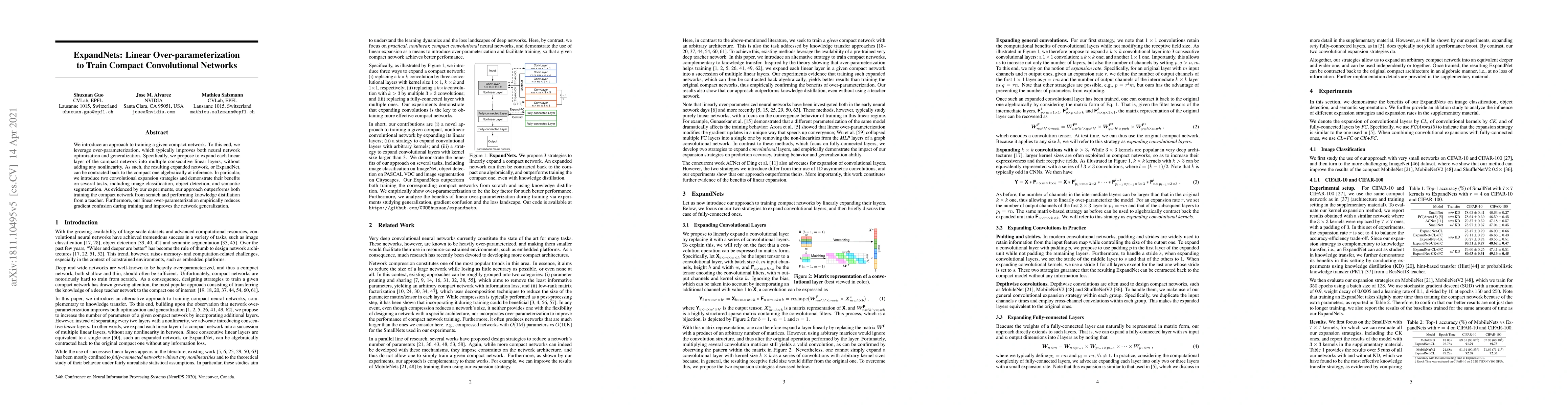This paper proposes ExpandNets, a method that trains compact convolutional networks by temporarily expanding each linear layer into multiple consecutive linear layers without introducing non-linearities. The expanded network can be contracted back to its original size for inference, and the approach shows improved performance over training from scratch and knowledge distillation, along with enhanced generalization.