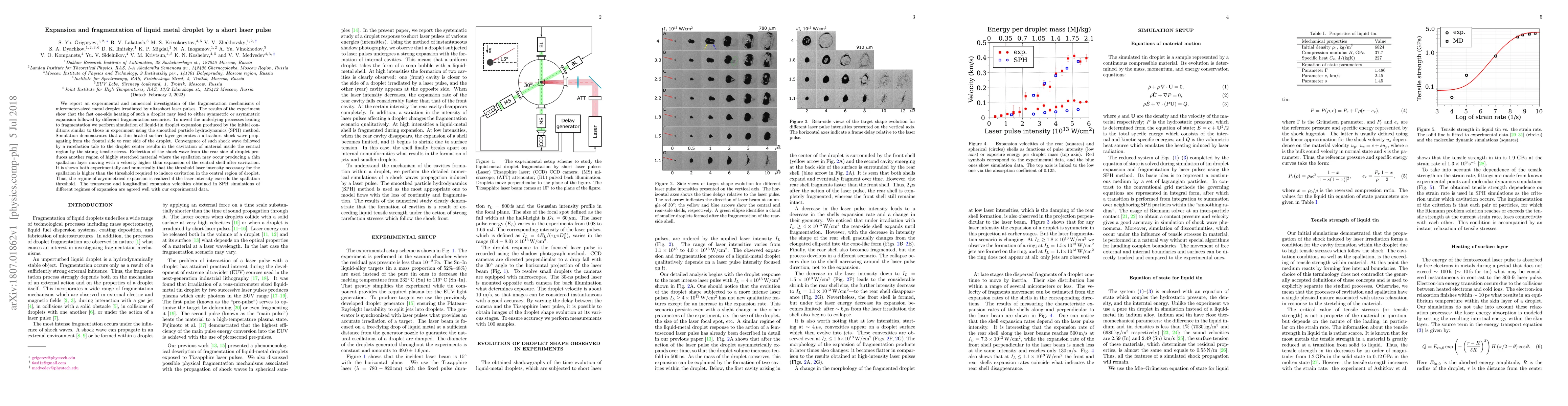 We report an experimental and numerical investigation of the fragmentation mechanisms of micrometer-sized metal droplet irradiated by ultrashort laser pulses. The results of the experiment show that the fast one-side heating of such a droplet may lead to either symmetric or asymmetric expansion followed by different fragmentation scenarios. To unveil the underlying processes leading to fragmentation we perform simulation of liquid-tin droplet expansion produced by the initial conditions similar to those in experiment using the smoothed particle hydrodynamics (SPH) method. Simulation demonstrates that a thin heated surface layer generates a ultrashort shock wave propagating from the frontal side to rear side of the droplet. Convergence of such shock wave followed by a rarefaction tale to the droplet center results in the cavitation of material inside the central region by the strong tensile stress. Reflection of the shock wave from the rear side of droplet produces another region of highly stretched material where the spallation may occur producing a thin spallation layer moving with a velocity higher than expansion of the central shell after cavitation. It is shown both experimentally and numerically that the threshold laser intensity necessary for the spallation is higher than the threshold required to induce cavitation in the central region of droplet. Thus, the regime of asymmetrical expansion is realized if the laser intensity exceeds the spallation threshold. The transverse and longitudinal expansion velocities obtained in SPH simulations of different regimes of expansion are agreed well with our experimental data.