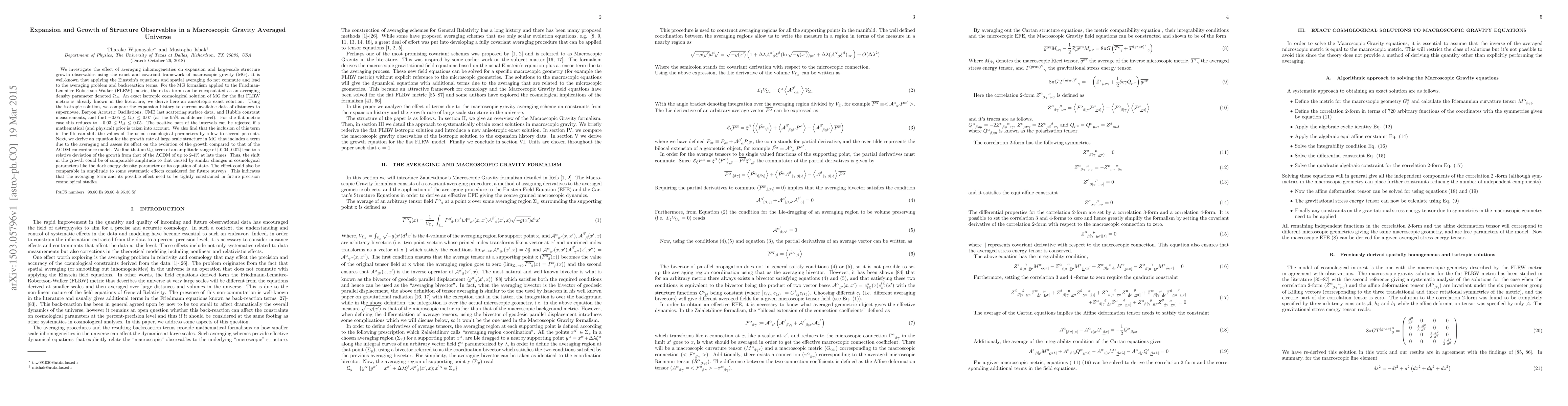 Researchers investigate how averaging inhomogeneities affects expansion and large-scale structure growth in a macroscopic gravity universe, finding constraints on an additional parameter ($ u_A$) that shifts cosmological parameters by a few to several percent.