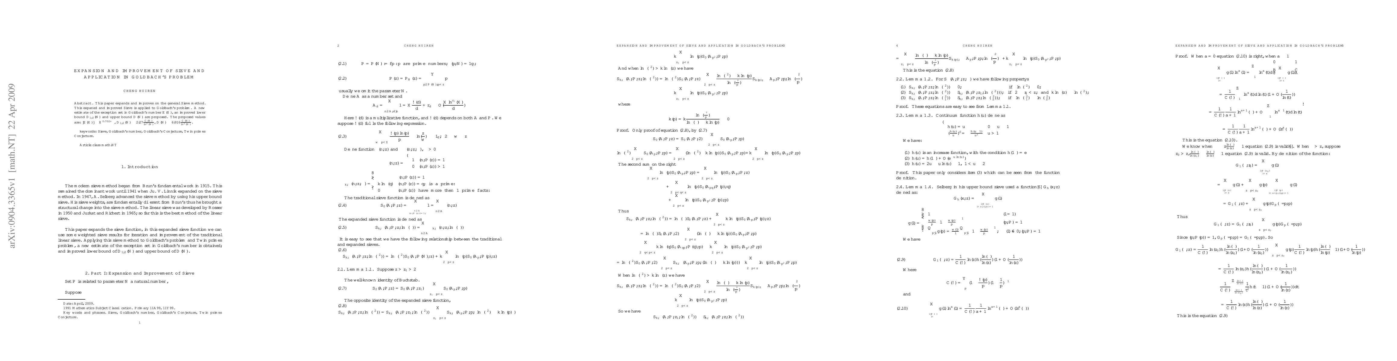 This paper expands and improves on the general Sieve method. This expaned and improved Sieve is applied to Goldbach's problem. A new estimate of the exception set in Goldbach's number E(X), an improved lower bound D_{1,2}(N) and upper bound D(N) are proposed. The proposed values are: |E(X)|<= X^{0.702+e}, D_{1,2}(N)>= 2.27C(N)/ln^{2}(N), D(N) <= 6.916C(N)/ln^{2}(N).