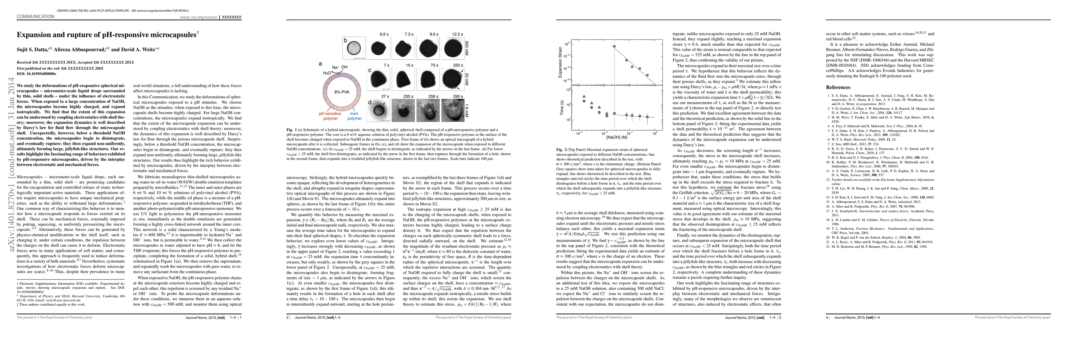 This paper investigates the expansion and rupture of charged, pH-responsive microcapsules under electrostatic forces, revealing that while high NaOH concentrations cause isotropic expansion, lower concentrations lead to disintegration and non-uniform expansion, forming jellyfish-like structures. The study combines electrostatics and shell theory to explain these behaviors.