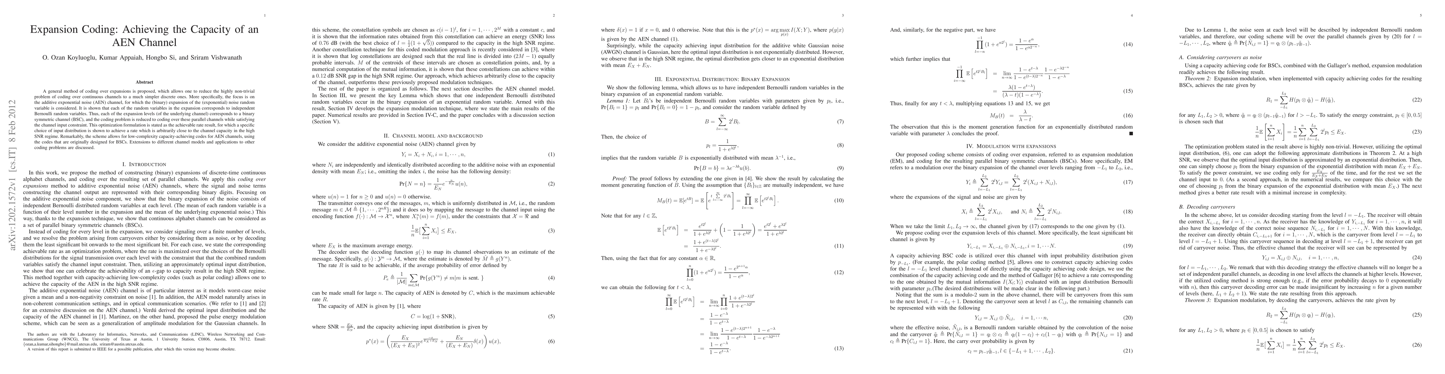 This paper proposes a coding method over expansions to simplify coding for continuous channels, specifically the additive exponential noise (AEN) channel. It reduces the problem to coding over parallel binary symmetric channels (BSCs) and achieves near-capacity rates using low-complexity codes designed for BSCs.