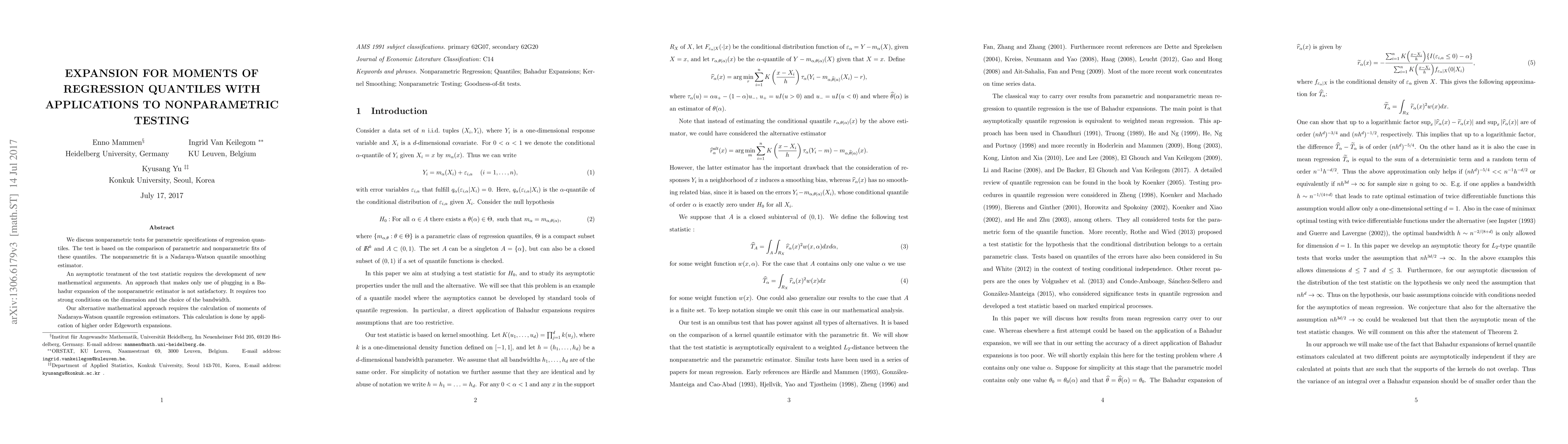 This paper develops a new nonparametric test for parametric regression quantiles, comparing parametric and Nadaraya-Watson nonparametric fits. It introduces a novel mathematical approach based on higher order Edgeworth expansions to calculate moments of the nonparametric estimator, overcoming limitations of previous Bahadur expansion methods.