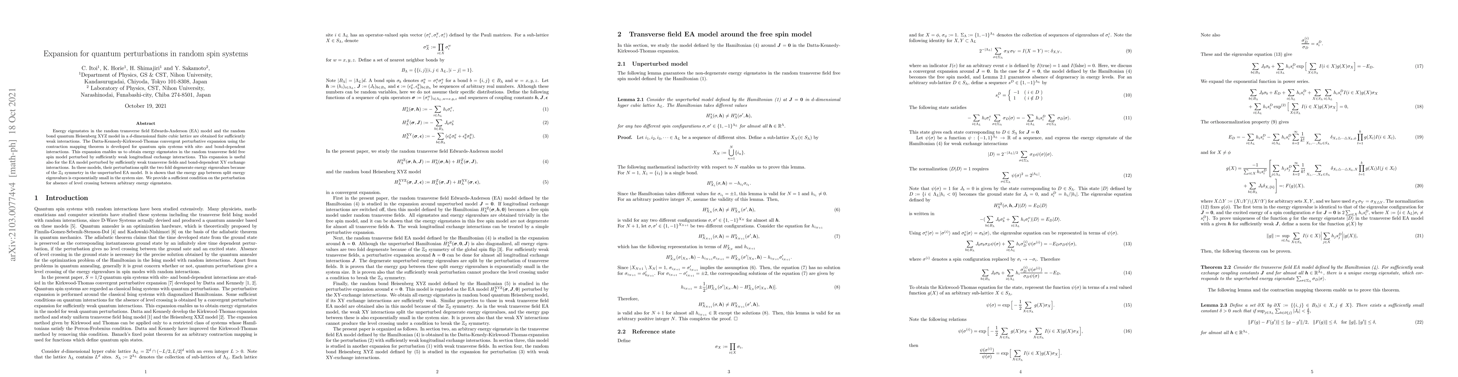 Energy eigenstates in the random transverse field Edwards-Anderson (EA) model and the random bond quantum Heisenberg XYZ model in a $d$-dimensional finite cubic lattice are obtained for sufficiently weak interactions. The Datta-Kennedy-Kirkwood-Thomas convergent perturbative expansion using the contraction mapping theorem is developed for quantum spin systems with site- and bond-dependent interactions. This expansion enables us to obtain energy eigenstates in the random transverse field free spin model perturbed by sufficiently weak longitudinal exchange interactions. This expansion is useful also for the EA model perturbed by sufficiently weak transverse fields and bond-dependent XY exchange interactions. In these models, their perturbations split the two fold degenerate energy eigenvalues because of the ${\mathbb Z}_2$ symmetry in the unperturbed EA model. It is shown that the energy gap between split energy eigenvalues is exponentially small in the system size. We provide a sufficient condition on the perturbation for absence of level crossing between arbitrary energy eigenstates.