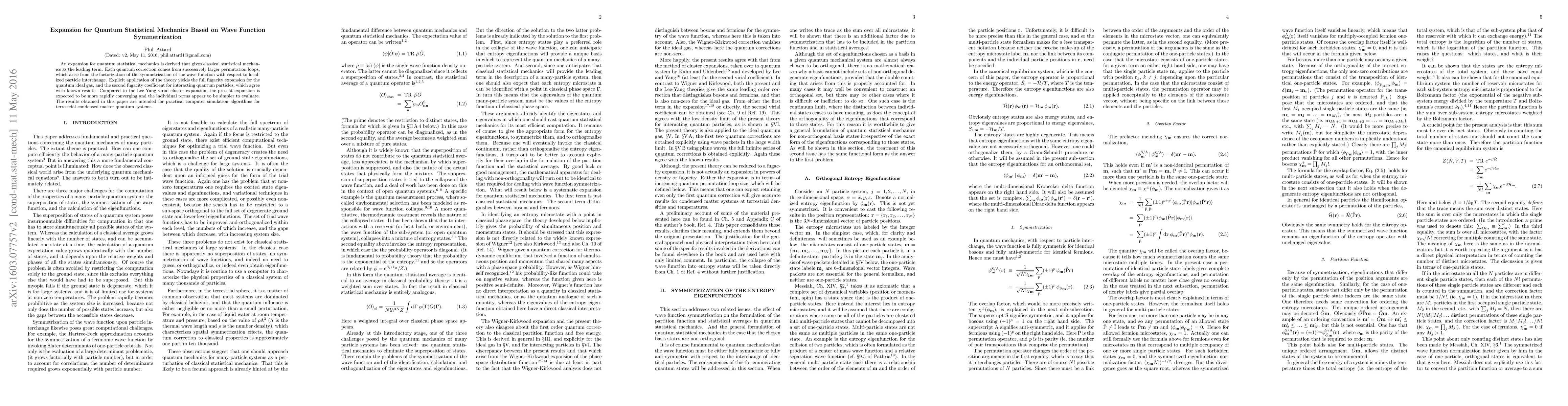 An expansion for quantum statistical mechanics is derived that gives classical statistical mechanics as the leading term. Each quantum correction comes from successively larger permutation loops, which arise from the factorization of the symmetrization of the wave function with respect to localized particle interchange. Explicit application of the theory yields the full fugacity expansion for the quantum ideal gas, and the second fugacity coefficient for interacting quantum particles, which agree with known results. Compared to the Lee-Yang virial cluster expansion, the present expansion is expected to be more rapidly converging and the individual terms appear to be simpler to evaluate. The results obtained in this paper are intended for practical computer simulation algorithms for terrestrial condensed matter quantum systems.
