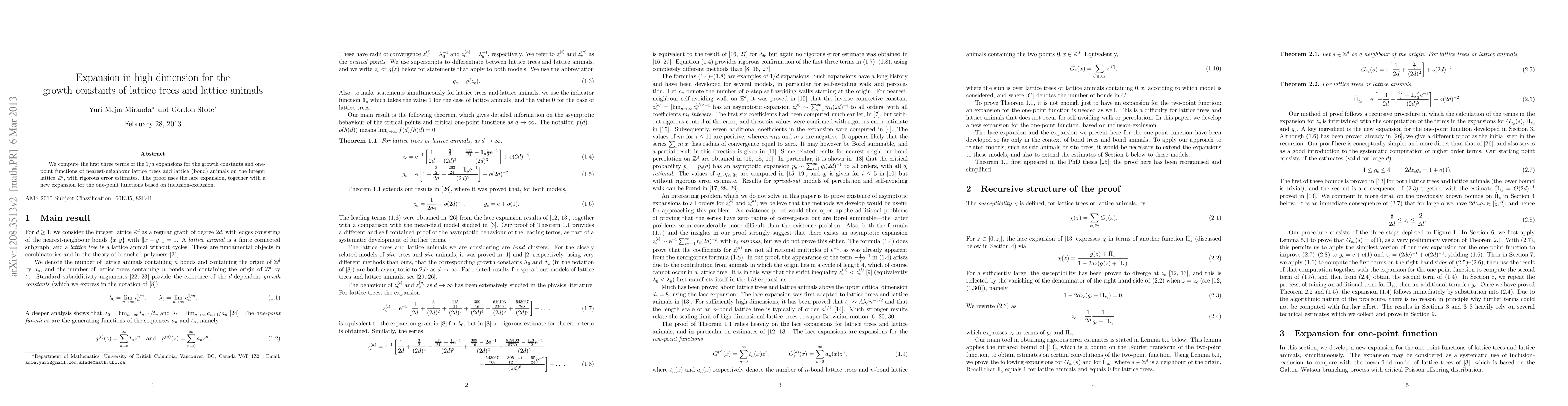 We compute the first three terms of the 1/d expansions for the growth constants and one-point functions of nearest-neighbour lattice trees and lattice (bond) animals on the integer lattice Zd, with rigorous error estimates. The proof uses the lace expansion, together with a new expansion for the one-point functions based on inclusion-exclusion.