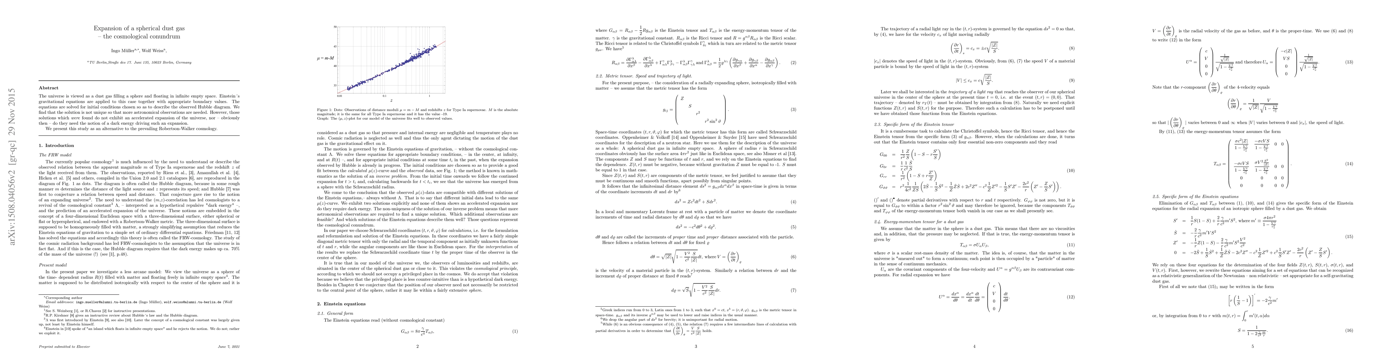 The universe is viewed as a dust gas filling a sphere and floating in infinite empty space. Einstein's gravitational equations are applied to this case together with appropriate boundary values. The equations are solved for initial conditions chosen so as to describe the observed Hubble diagram. We find that the solution is not unique so that more astronomical observations are needed. However, those solutions which were found do not exhibit an accelerated expansion of the universe, nor -- obviously then -- do they need the notion of a dark energy driving such an expansion. We present this study as an alternative to the prevailing Robertson-Walker cosmology.