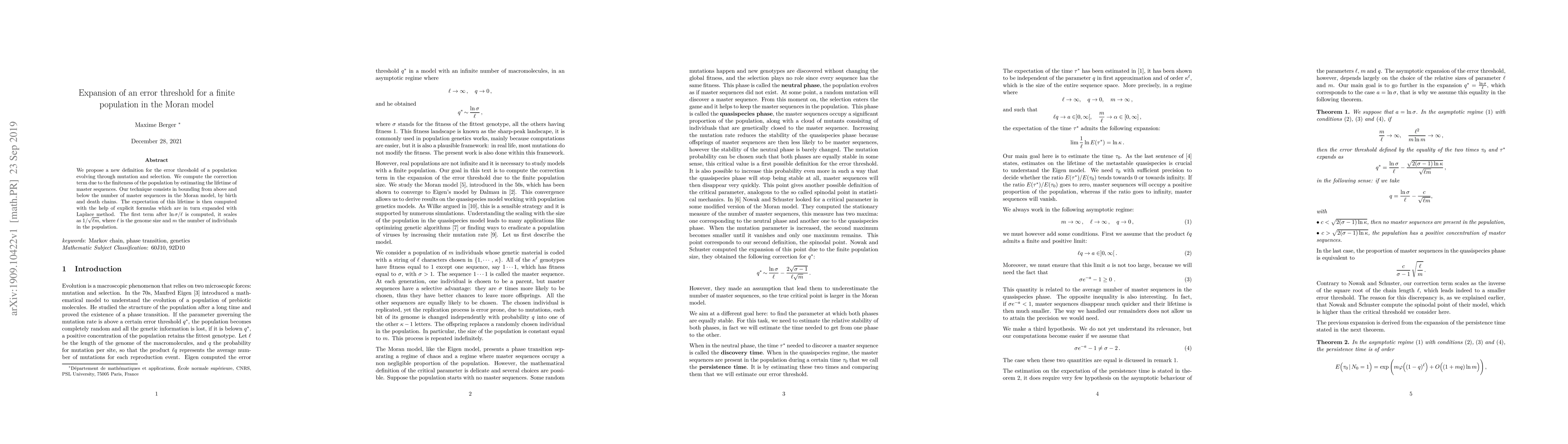 This paper proposes a new definition for the error threshold in the Moran model, incorporating a correction term for the finite population size. It estimates the lifetime of master sequences using birth and death chains, and computes the expectation of this lifetime using Laplace method, revealing a scaling behavior of $1/\sqrt(\ell m)$.