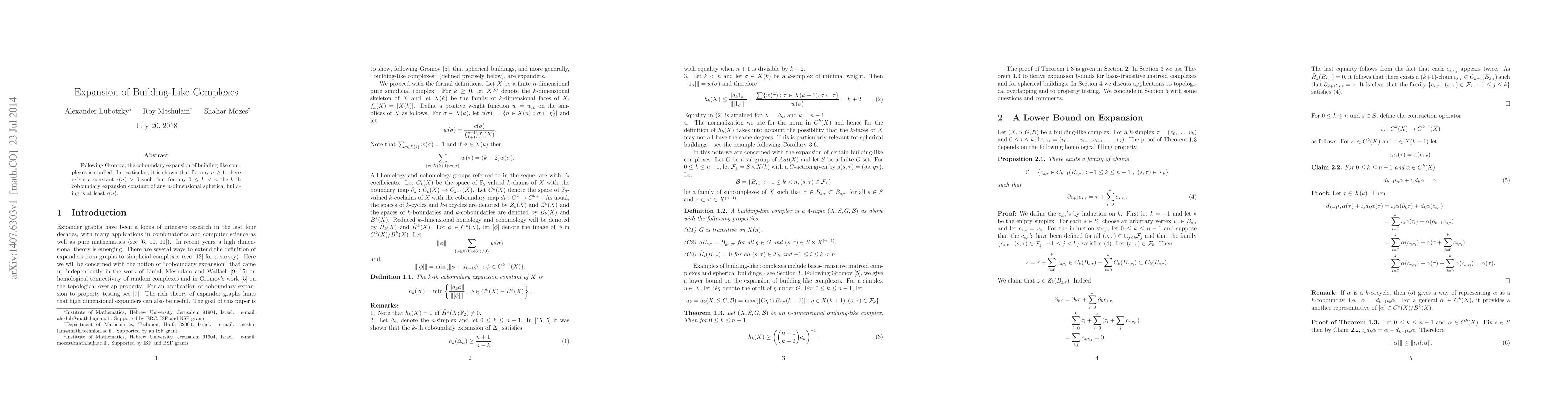 Two-line summary: This paper studies the coboundary expansion of building-like complexes, demonstrating that for any $n \geq 1$, there exists a constant $\epsilon(n)>0$ ensuring that the $k$-th coboundary expansion constant for any $n$-dimensional spherical building is at least $\epsilon(n)$ for $0 \leq k < n$. The results follow Gromov's foundational work on the subject.