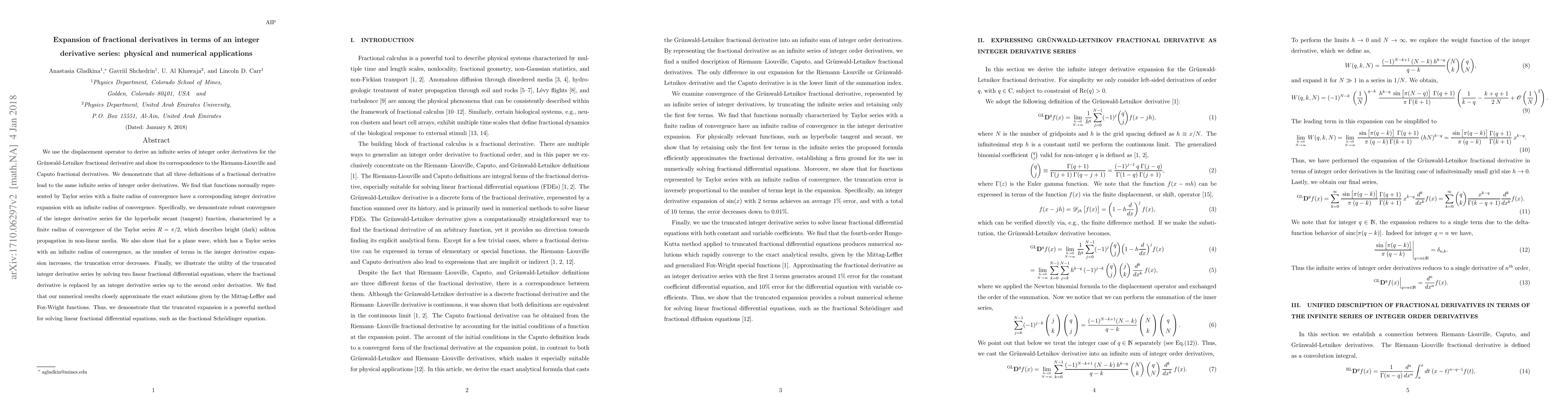 We use the displacement operator to derive an infinite series of integer order derivatives for the Gr\"{u}nwald-Letnikov fractional derivative and show its correspondence to the Riemann-Liouville and Caputo fractional derivatives. We demonstrate that all three definitions of a fractional derivative lead to the same infinite series of integer order derivatives. We find that functions normally represented by Taylor series with a finite radius of convergence have a corresponding integer derivative expansion with an infinite radius of convergence. Specifically, we demonstrate robust convergence of the integer derivative series for the hyperbolic secant (tangent) function, characterized by a finite radius of convergence of the Taylor series $R=\pi/2$, which describes bright (dark) soliton propagation in non-linear media. We also show that for a plane wave, which has a Taylor series with an infinite radius of convergence, as the number of terms in the integer derivative expansion increases, the truncation error decreases. Finally, we illustrate the utility of the truncated integer derivative series by solving two linear fractional differential equations, where the fractional derivative is replaced by an integer derivative series up to the second order derivative. We find that our numerical results closely approximate the exact solutions given by the Mittag-Leffler and Fox-Wright functions. Thus, we demonstrate that the truncated expansion is a powerful method for solving linear fractional differential equations, such as the fractional Schr\"{o}dinger equation.