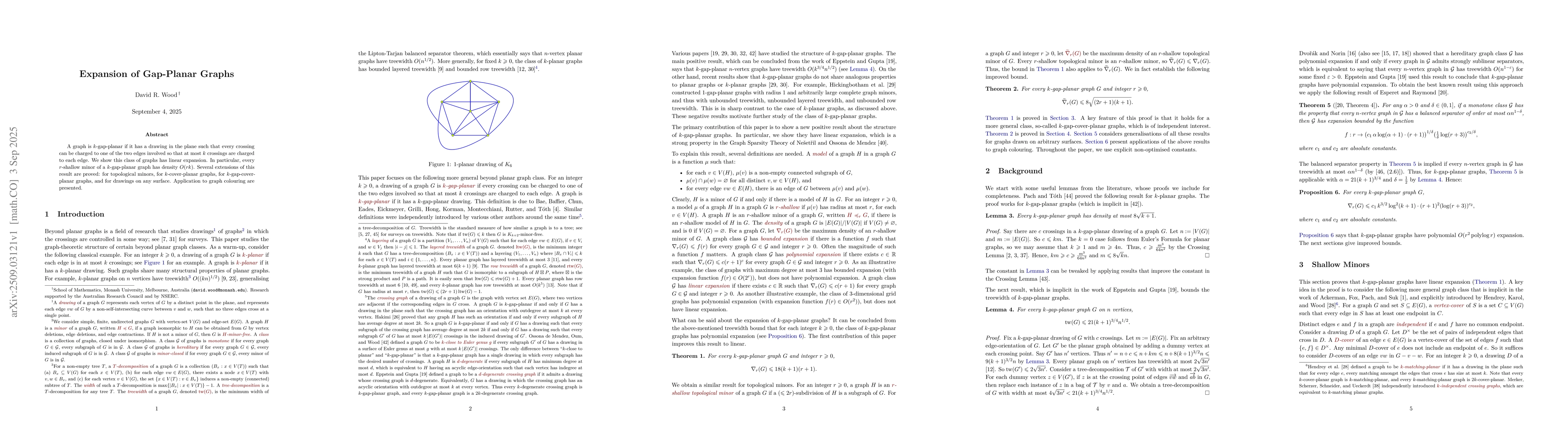 A graph is $k$-gap-planar if it has a drawing in the plane such that every crossing can be charged to one of the two edges involved so that at most $k$ crossings are charged to each edge. We show this class of graphs has linear expansion. In particular, every $r$-shallow minor of a $k$-gap-planar graph has density $O(rk)$. Several extensions of this result are proved: for topological minors, for $k$-cover-planar graphs, for $k$-gap-cover-planar graphs, and for drawings on any surface. Application to graph colouring are presented.