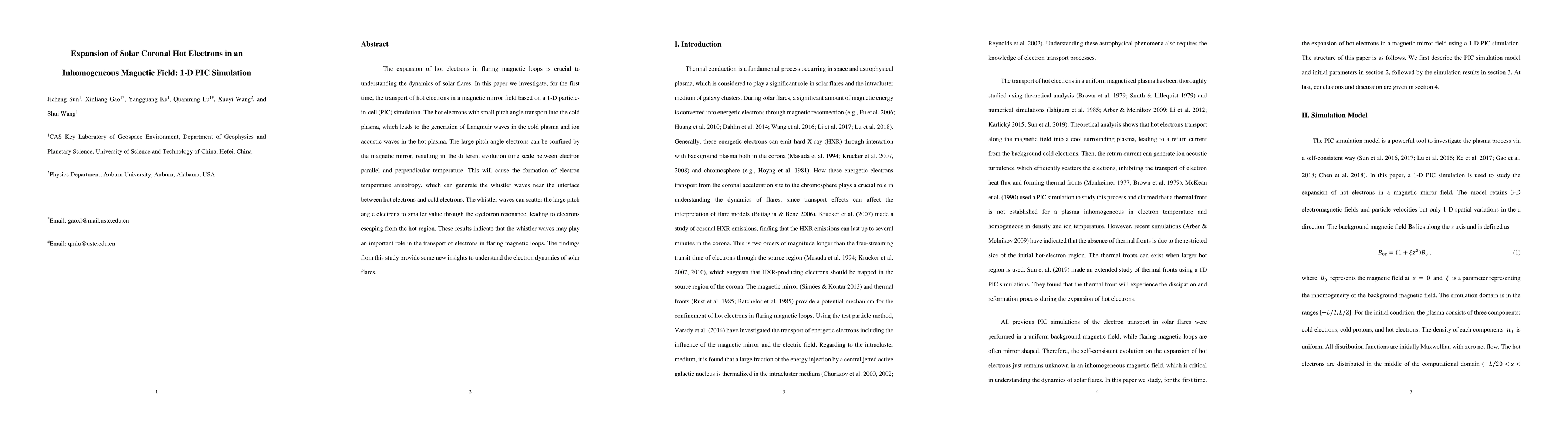 The expansion of hot electrons in flaring magnetic loops is crucial to understanding the dynamics of solar flares. In this paper we investigate, for the first time, the transport of hot electrons in a magnetic mirror field based on a 1-D particle-in-cell (PIC) simulation. The hot electrons with small pitch angle transport into the cold plasma, which leads to the generation of Langmuir waves in the cold plasma and ion acoustic waves in the hot plasma. The large pitch angle electrons can be confined by the magnetic mirror, resulting in the different evolution time scale between electron parallel and perpendicular temperature. This will cause the formation of electron temperature anisotropy, which can generate the whistler waves near the interface between hot electrons and cold electrons. The whistler waves can scatter the large pitch angle electrons to smaller value through the cyclotron resonance, leading to electrons escaping from the hot region. These results indicate that the whistler waves may play an important role in the transport of electrons in flaring magnetic loops. The findings from this study provide some new insights to understand the electron dynamics of solar flares.