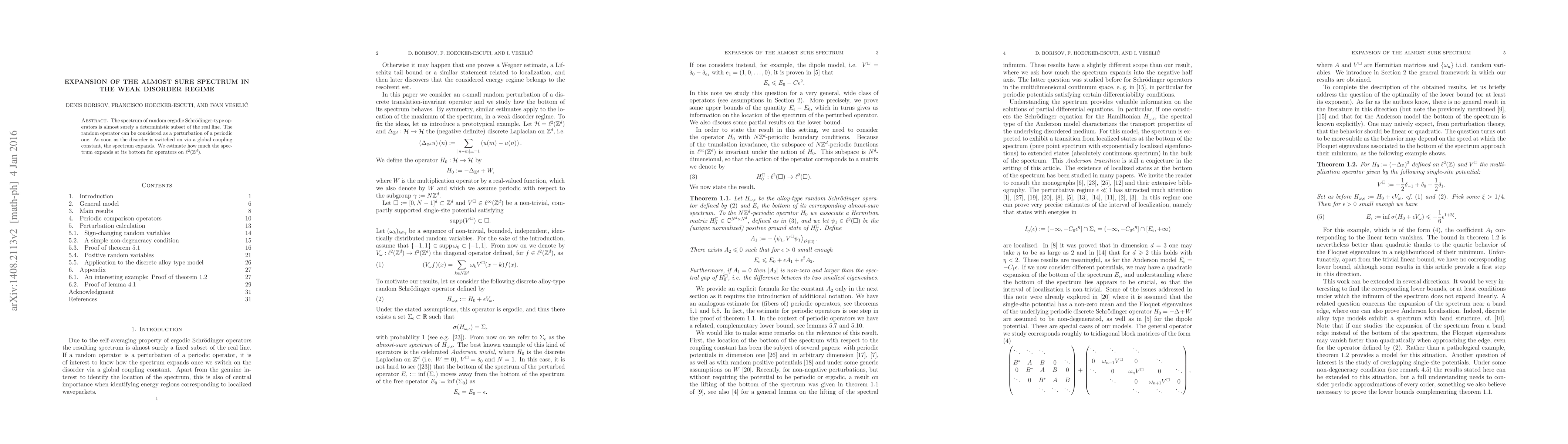 This paper explores the expansion of the almost sure spectrum of random ergodic Schrödinger operators in the weak disorder regime, estimating the expansion at the spectrum's bottom when a periodic operator is perturbed by a small global coupling constant in $\ell^2(\mathbb Z^d)$.