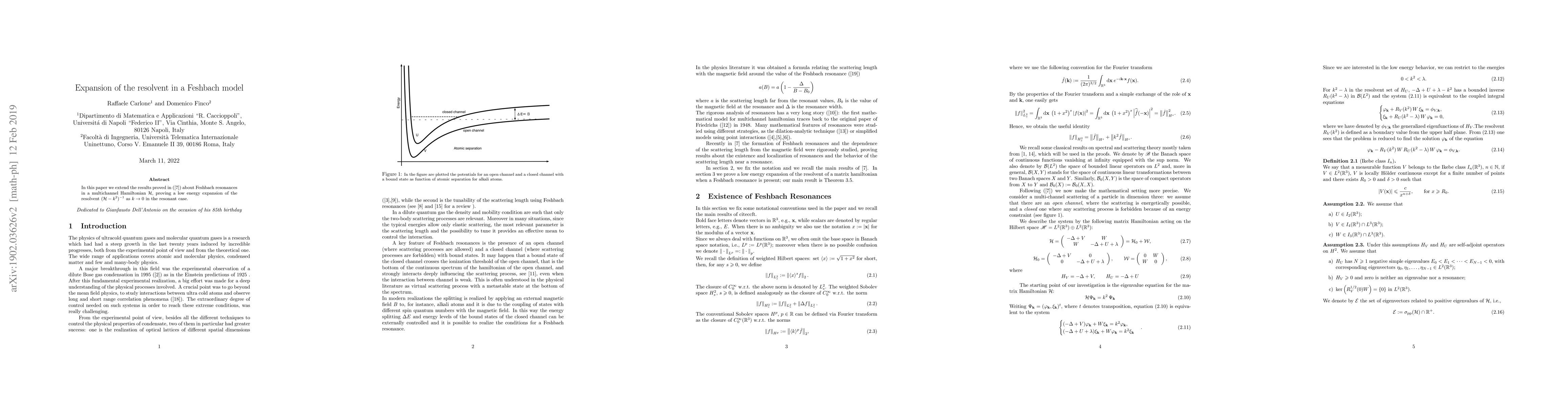 In this paper we extend the results proved in (Carlone, R., Correggi, M., Finco, D., Teta, A.: A model for Feshbach Resonances arXiv:1901.08282 [math-ph]) about Feshbach resonances in a multichannel Hamiltonian $\mathcal{H}$, proving a low energy expansion of the resolvent $(\mathcal{H}-k^{2})^{-1}$ as $k\to 0$ in the resonant case.