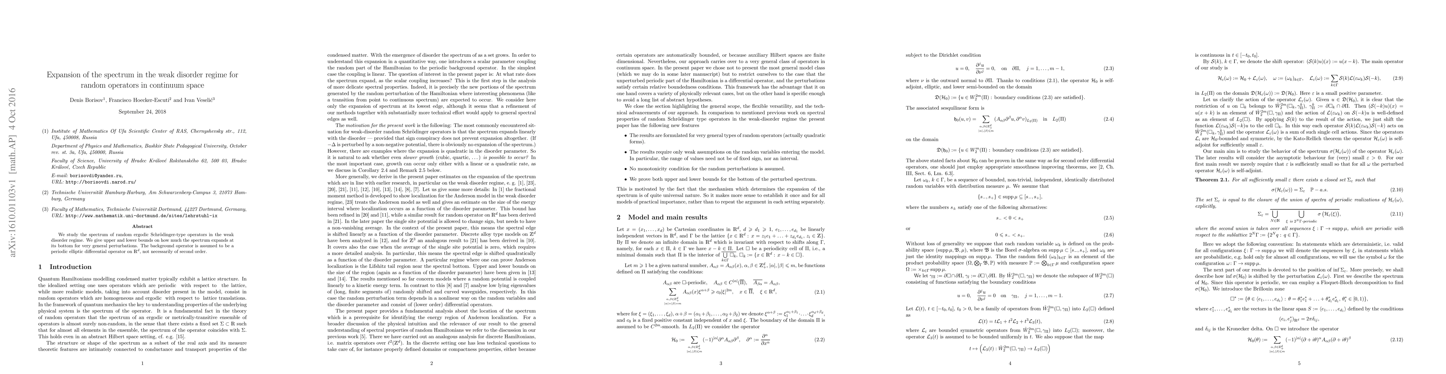 This paper investigates the spectral expansion of random ergodic Schrödinger-type operators in the weak disorder regime, providing upper and lower bounds on the spectrum expansion at its bottom for general perturbations. The study focuses on periodic elliptic differential operators in continuum space.