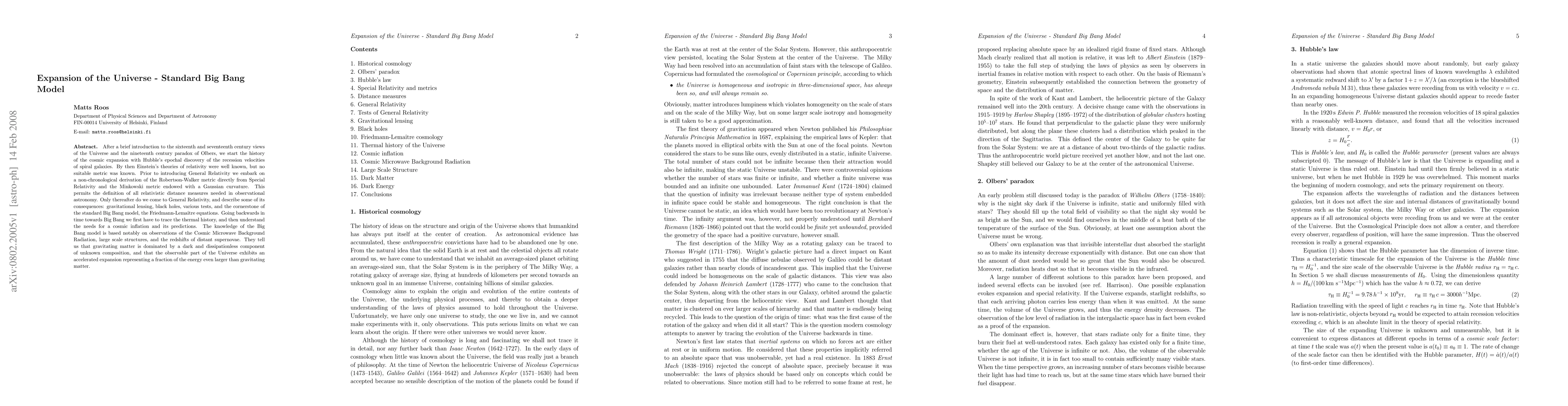 After a brief introduction to the sixteenth and seventeenth century views of the Universe and the nineteenth century paradox of Olbers, we start the history of the cosmic expansion with Hubble's epochal discovery of the recession velocities of spiral galaxies. By then Einstein's theories of relativity were well known, but no suitable metric was known. Prior to introducing General Relativity we embark on a non-chronological derivation of the Robertson-Walker metric directly from Special Relativity and the Minkowski metric endowed with a Gaussian curvature. This permits the definition of all relativistic distance measures needed in observational astronomy. Only thereafter do we come to General Relativity, and describe some of its consequences: gravitational lensing, black holes, various tests, and the cornerstone of the standard Big Bang model, the Friedmann-Lemaitre equations. Going backwards in time towards Big Bang we first have to trace the thermal history, and then understand the needs for a cosmic inflation and its predictions. The knowledge of the Big Bang model is based notably on observations of the Cosmic Microwave Background Radiation, large scale structures, and the redshifts of distant supernovae. They tell us that gravitating matter is dominated by a dark and dissipationless component of unknown composition, and that the observable part of the Universe exhibits an accelerated expansion representing a fraction of the energy even larger than gravitating matter.