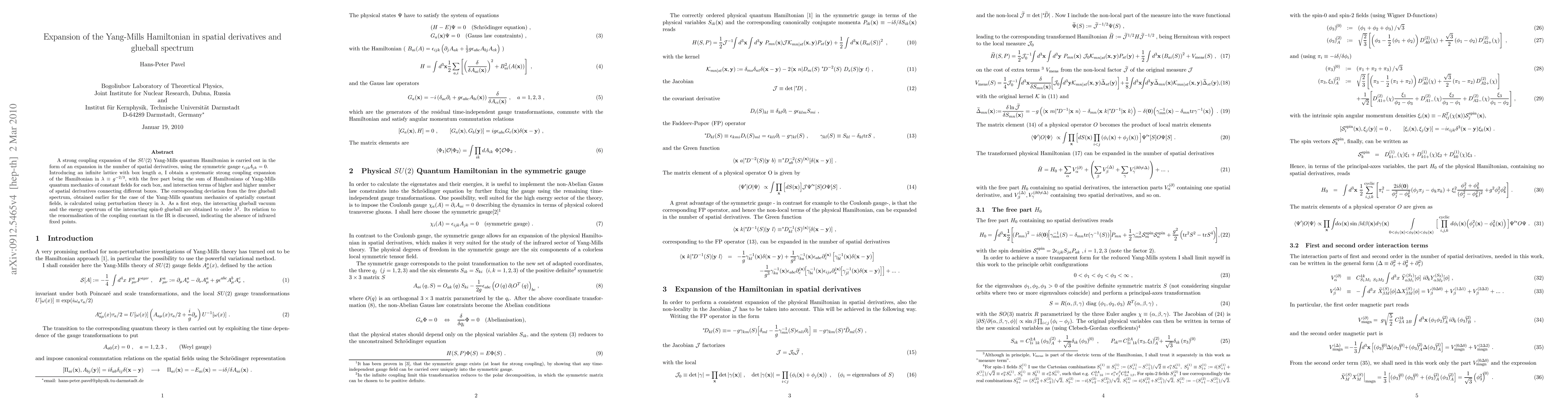 This paper expands the Yang-Mills Hamiltonian in spatial derivatives to study glueball spectrum, finding no infrared fixed points and a relation to coupling constant renormalization.