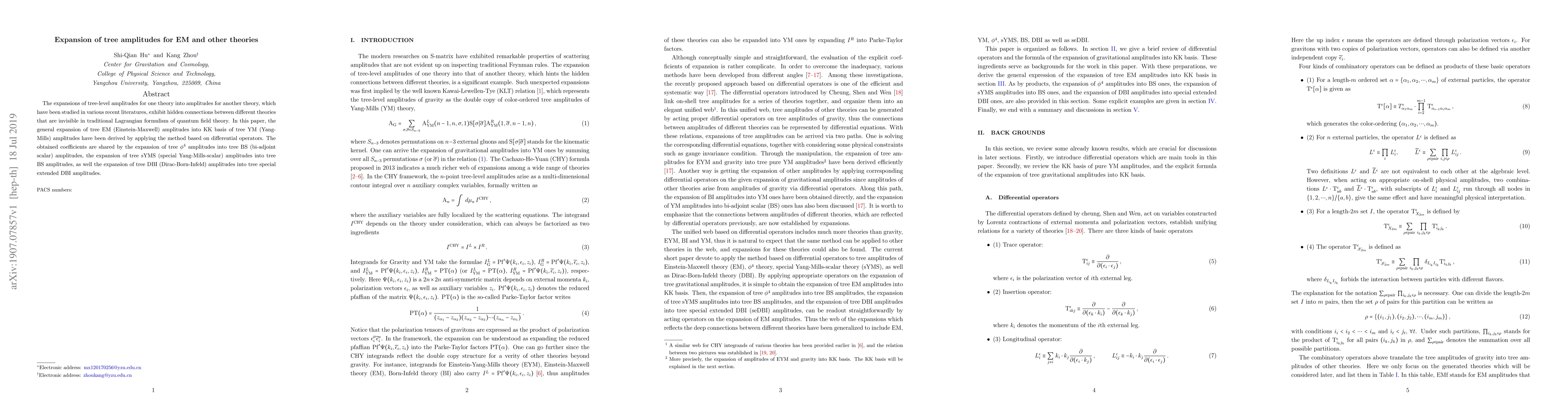 The expansions of tree-level amplitudes for one theory into amplitudes for another theory, which have been studied in various recent literatures, exhibit hidden connections between different theories that are invisible in traditional Lagrangian formulism of quantum field theory. In this paper, the general expansion of tree EM (Einstein-Maxwell) amplitudes into KK basis of tree YM (Yang-Mills) amplitudes have been derived by applying the method based on differential operators. The obtained coefficients are shared by the expansion of tree $\phi^4$ amplitudes into tree BS (bi-adjoint scalar) amplitudes, the expansion of tree sYMS (special Yang-Mills-scalar) amplitudes into tree BS amplitudes, as well the expansion of tree DBI (Dirac-Born-Infeld) amplitudes into tree special extended DBI amplitudes.