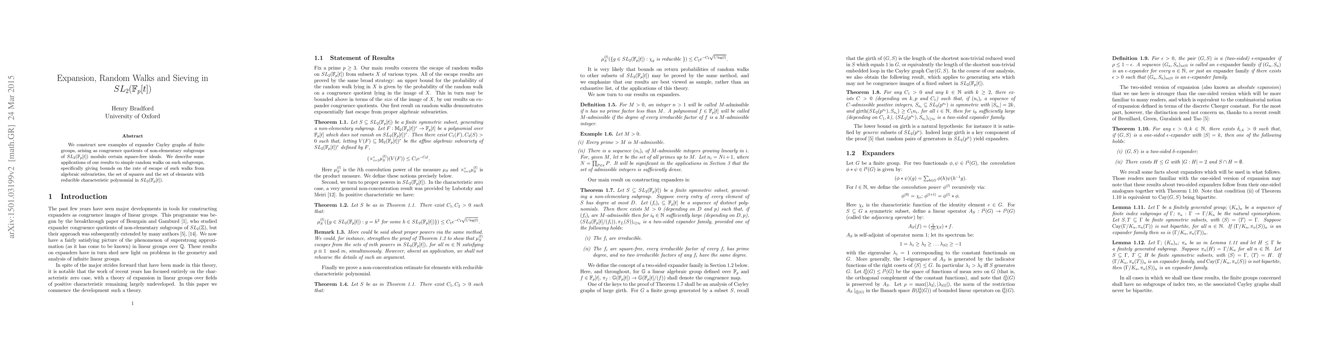 This paper constructs expander Cayley graphs from congruence quotients of non-elementary subgroups in $SL_2 (\mathbb{F}_p [t])$, and applies these to analyze the behavior of simple random walks, providing bounds on their escape rates from specific algebraic subsets.