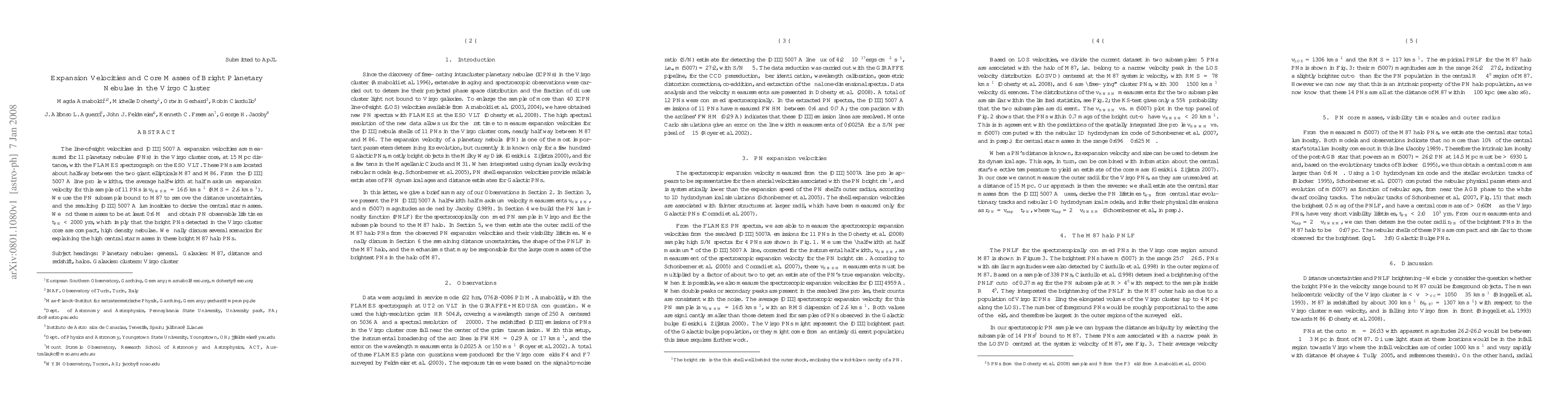 The line-of-sight velocities and [OIII] 5007 AA expansion velocities are measured for 11 planetary nebulae (PNs) in the Virgo cluster core, at 15 Mpc distance, with the FLAMES spectrograph on the ESO VLT. These PNs are located about halfway between the two giant ellipticals M87 and M86. From the [OIII] 5007 AA line profile widths, the average half-width at half maximum expansion velocity for this sample of 11 PNs is v_HWHM = 16.5 km/s (RMS=2.6 km/s). We use the PN subsample bound to M87 to remove the distance uncertainties, and the resulting [OIII] 5007 AA luminosities to derive the central star masses. We find these masses to be at least 0.6 M_sun and obtain PN observable life times t_PN < 2000 yrs, which imply that the bright PNs detected in the Virgo cluster core are compact, high density nebulae. We finally discuss several scenarios for explaining the high central star masses in these bright M87 halo PNs.