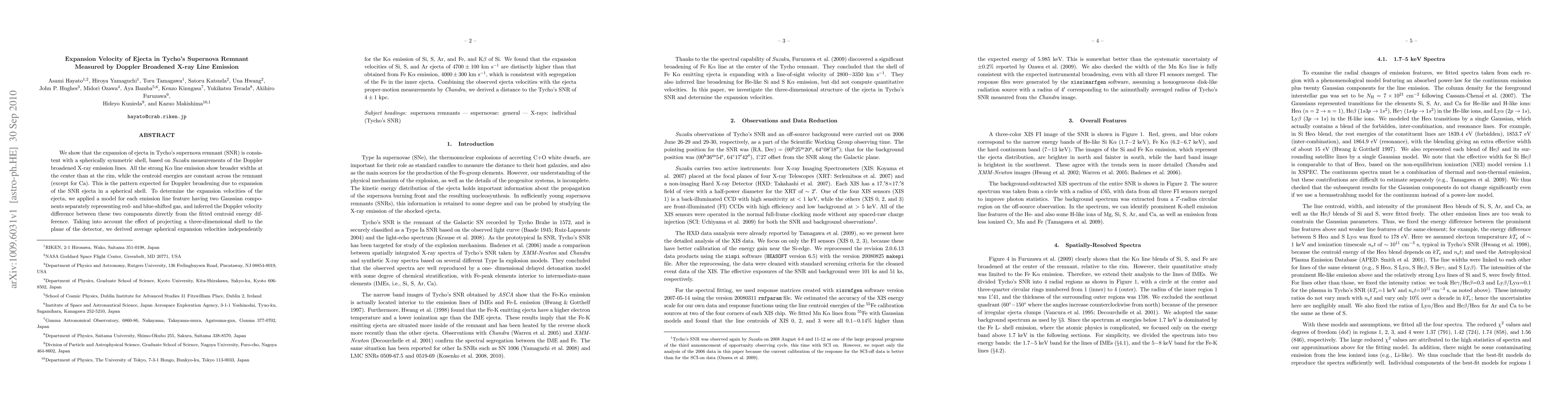This study uses Suzaku measurements of Doppler broadened X-ray lines to determine the expansion velocities of Tycho's supernova remnant ejecta, finding higher velocities for Si, S, and Ar (4700±100 km/s) compared to Fe (4000±300 km/s), indicating Fe segregation. The derived distance to the remnant is 4±1 kpc.