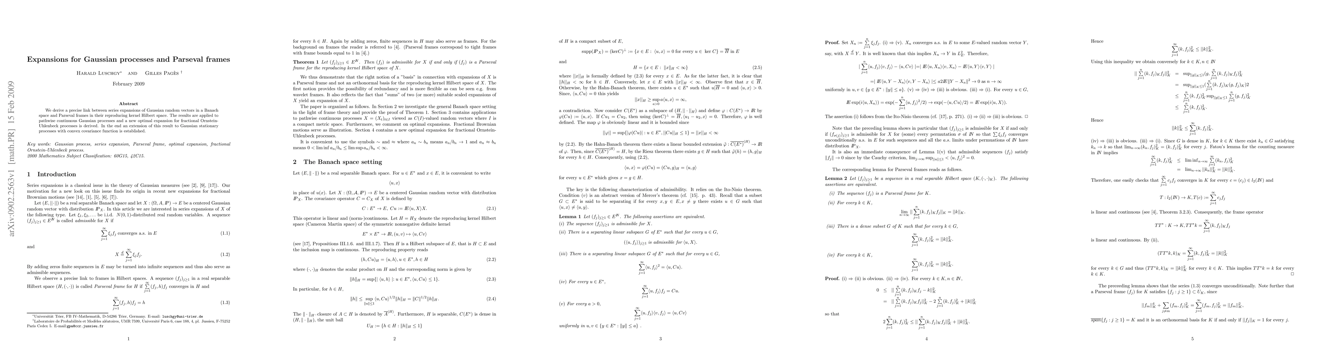 This paper establishes a connection between Gaussian random vector expansions in Banach spaces and Parseval frames in their reproducing kernel Hilbert spaces, applying these insights to derive optimal expansions for fractional Ornstein-Uhlenbeck processes and extending the results to Gaussian stationary processes with convex covariance functions.