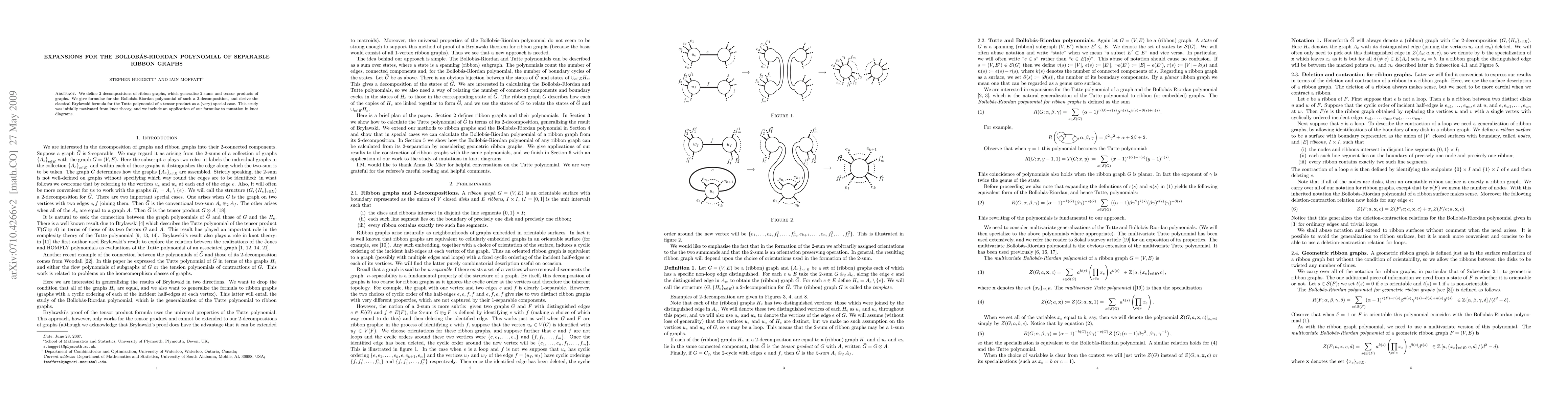 Summary: The paper introduces 2-decompositions of ribbon graphs to generalize graph operations, providing a formula for the Bollobas-Riordan polynomial for these decompositions and linking it to the Tutte polynomial. It finds an application in knot theory, specifically in understanding mutation in knot diagrams.