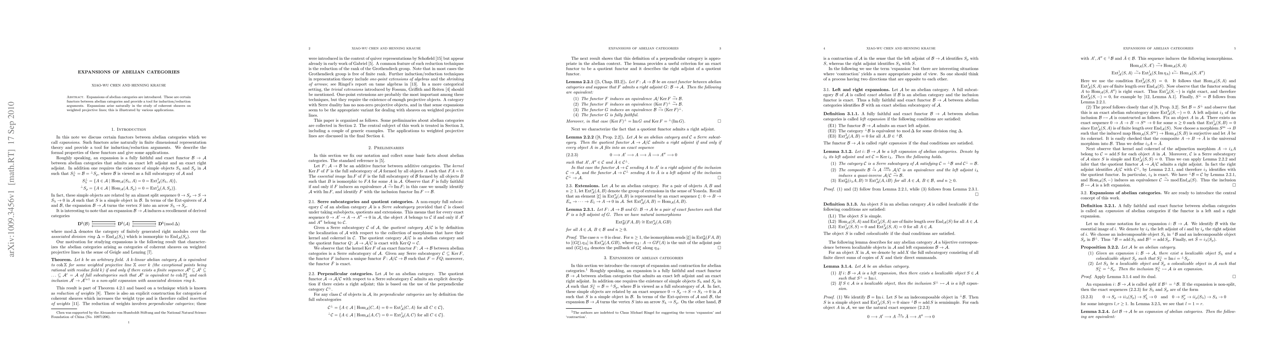 Expansions of abelian categories are introduced. These are certain functors between abelian categories and provide a tool for induction/reduction arguments. Expansions arise naturally in the study of coherent sheaves on weighted projective lines; this is illustrated by various applications.