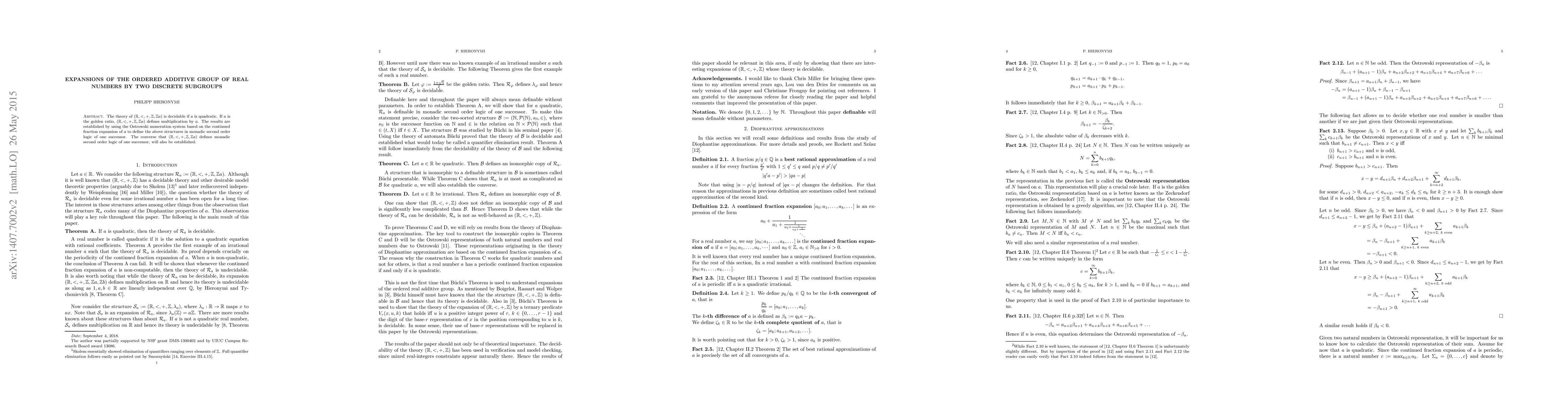The theory of $(\mathbb{R},<,+,\mathbb{Z},\mathbb{Z} a)$ is decidable if $a$ is quadratic. If $a$ is the golden ratio, $(\mathbb{R},<,+,\mathbb{Z},\mathbb{Z} a)$ defines multiplication by $a$. The results are established by using the Ostrowski numeration system based on the continued fraction expansion of $a$ to define the above structures in monadic second order logic of one successor. The converse that $(\mathbb{R},<,+,\mathbb{Z},\mathbb{Z} a)$ defines monadic second order logic of one successor, will also be established.